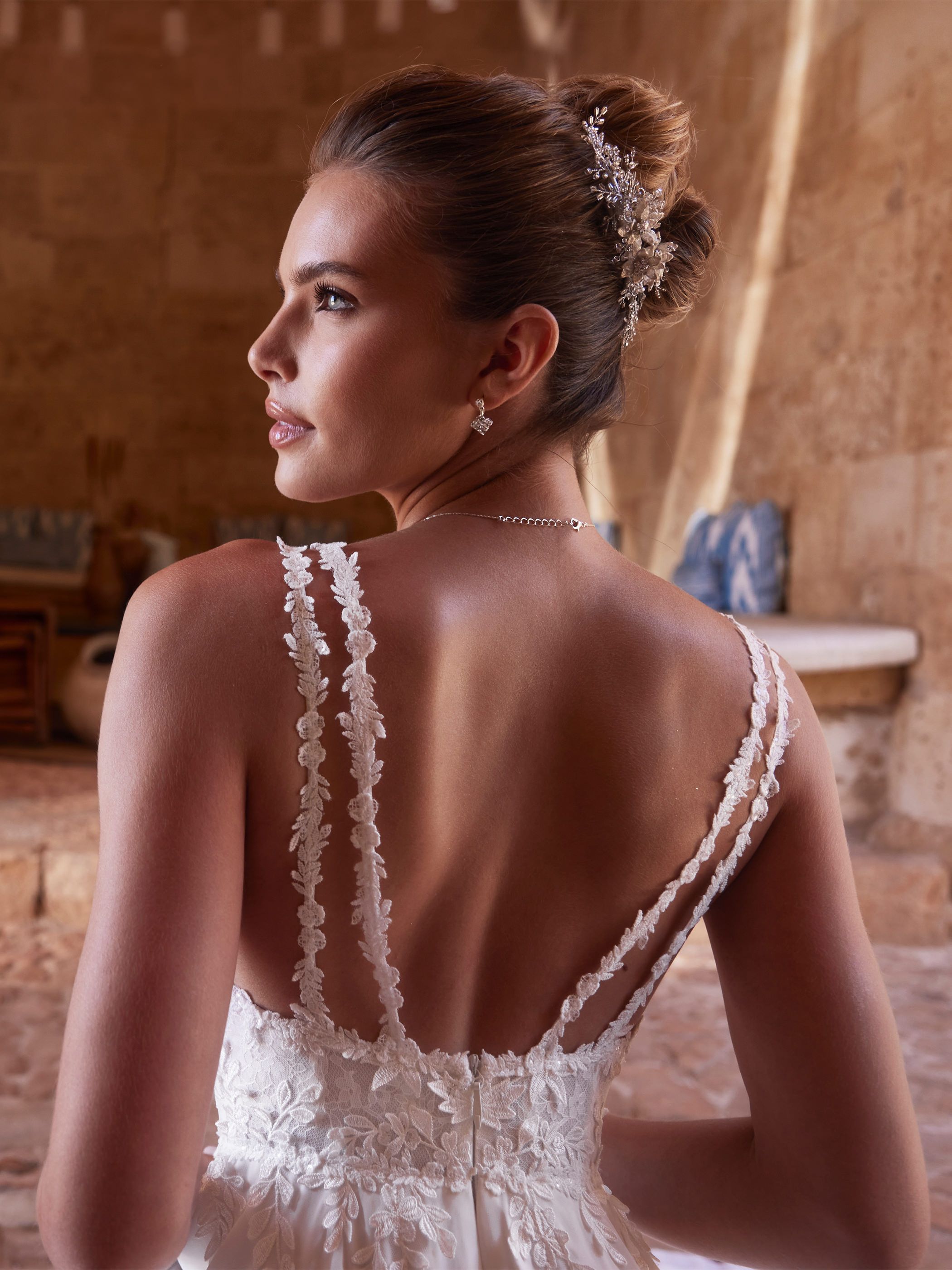 Éblouissante et raffinée, la robe de mariée KERENA de Bianco Evento est l'incarnation du romantisme bohème. Son corsage délicatement orné de dentelle florale se prolonge en de fines bretelles qui soulignent le dos ouvert avec élégance. Sa jupe fluide en mousseline offre un tombé aérien, sublimé par une fente subtile pour une touche de modernité. Idéale pour un mariage en plein air, sur la plage ou dans un cadre champêtre.