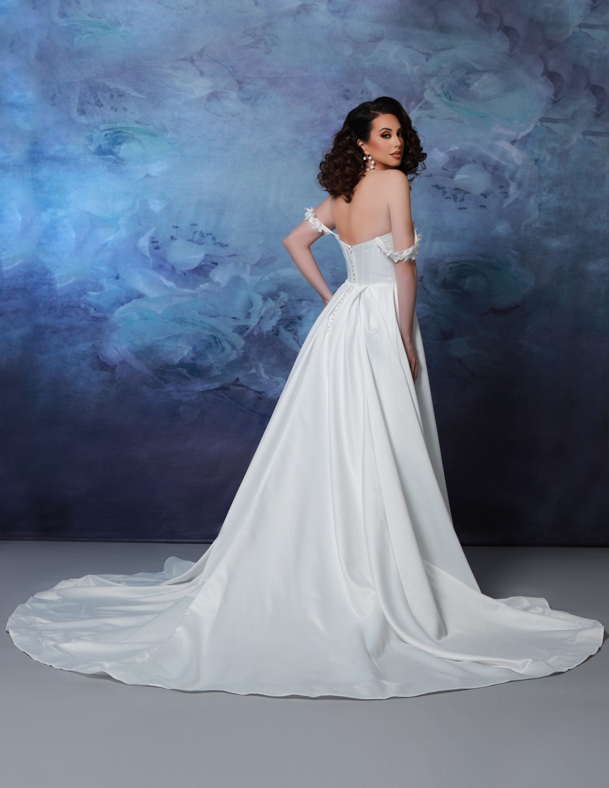 Let yourself be charmed by the elegance of the Laly wedding dress. Made of satin with a detachable strap, it is decorated with floral patterns and embellished with a subtle slit in the skirt. Its corset-style bodice with pleats at the bust gives you a sophisticated and exclusive look.