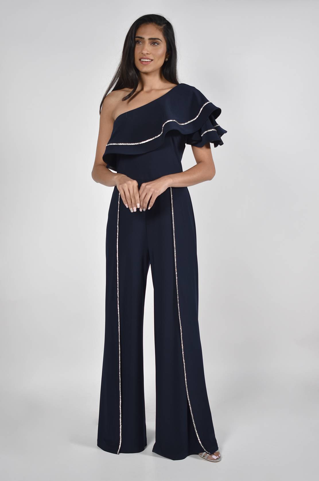 Description: Midnight colored one shoulder jumpsuit with rhinestones on the ruffles and along the legs.