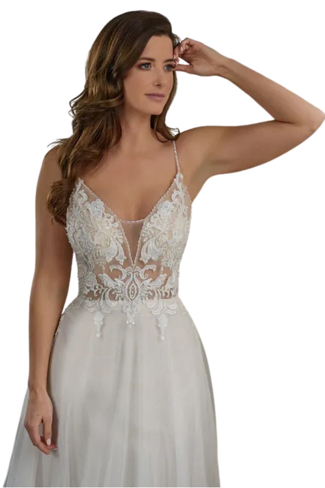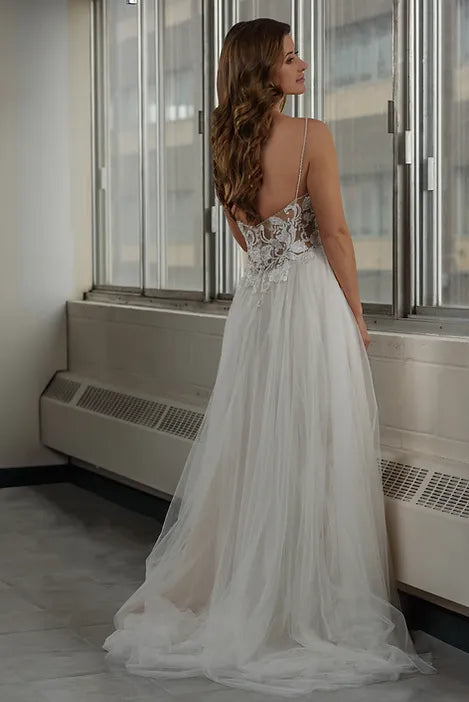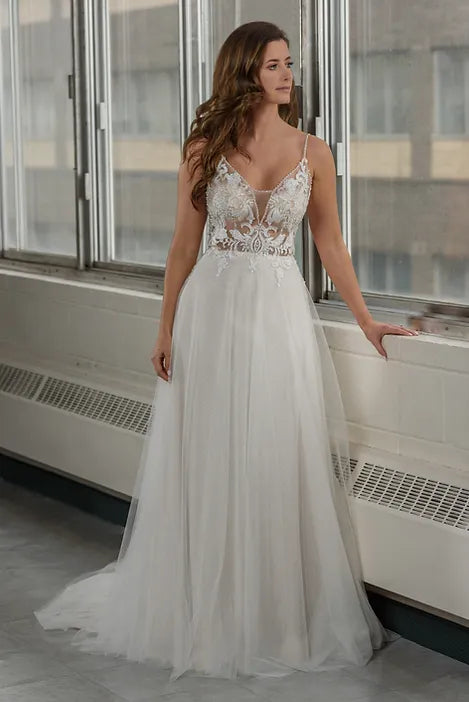 Description: Alia wedding dress is adorned with exquisite lace and decorated with sparkles and pearls. Made with a classic bodice, it offers a perfect silhouette filled with elegance and sophistication. Wear this dress with style and distinction.