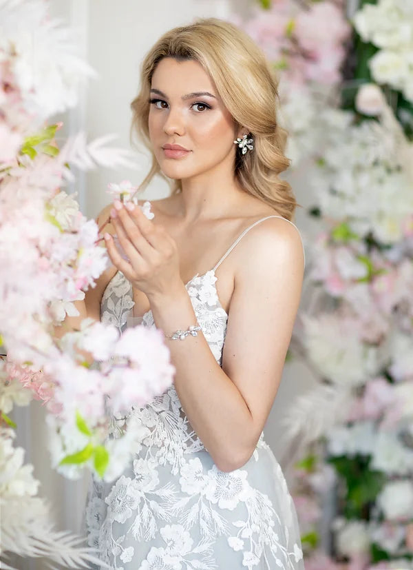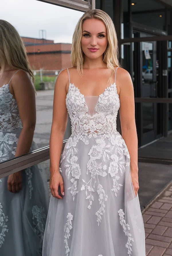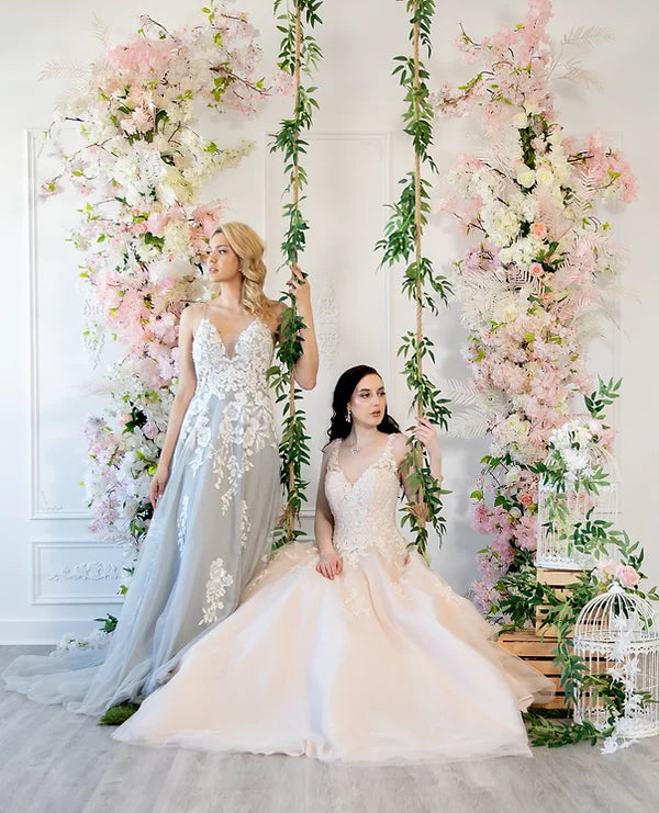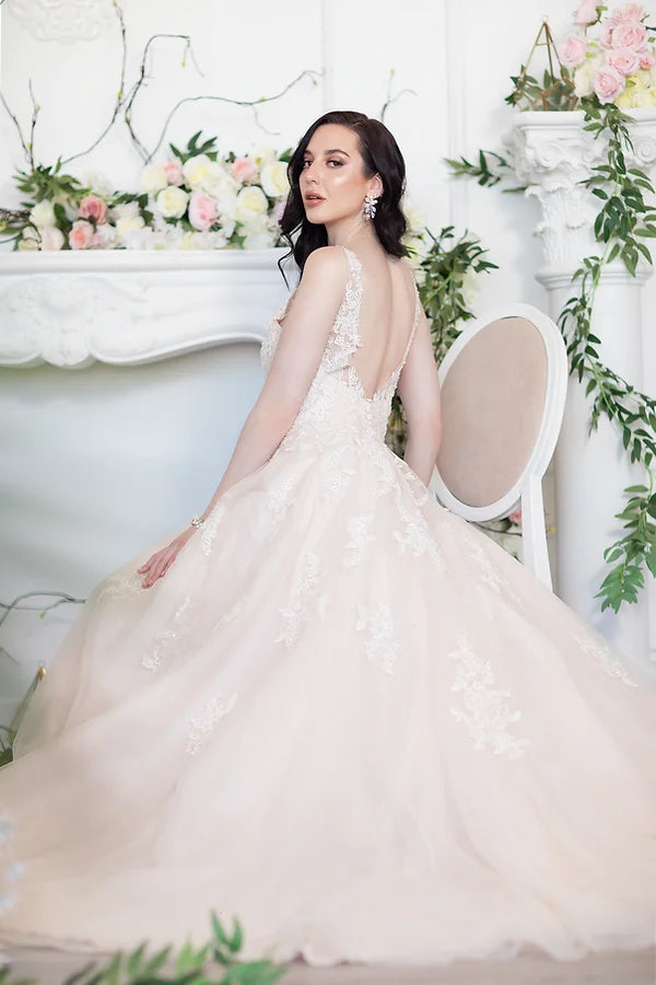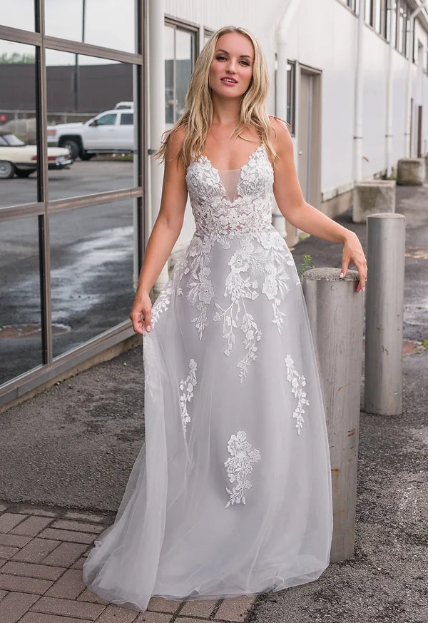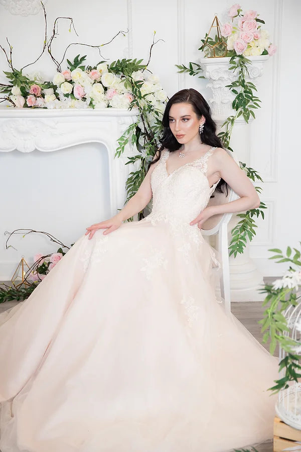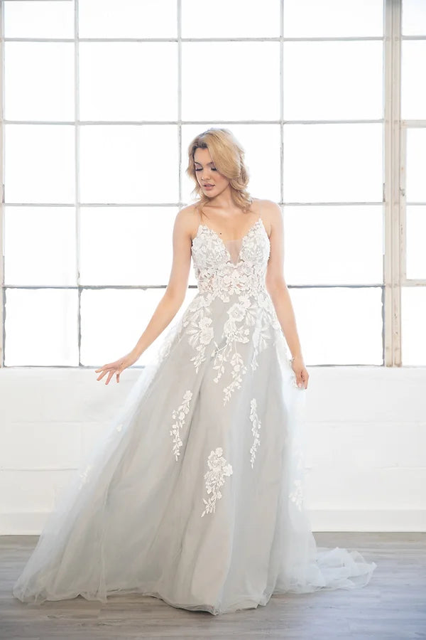 - The bodice is adorned with floral lace, tiny sequins and pearls