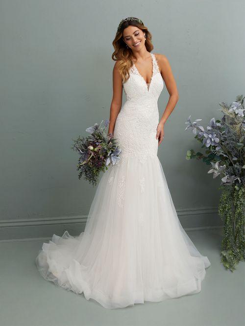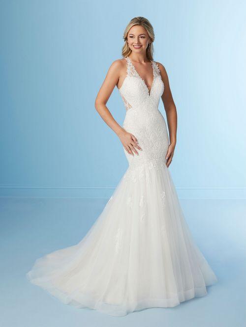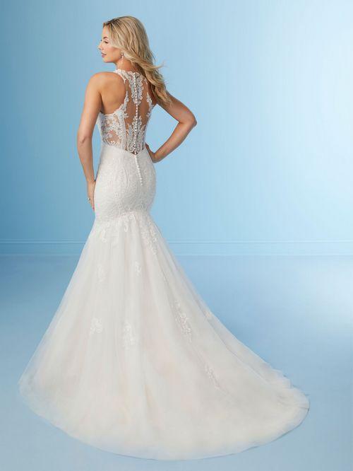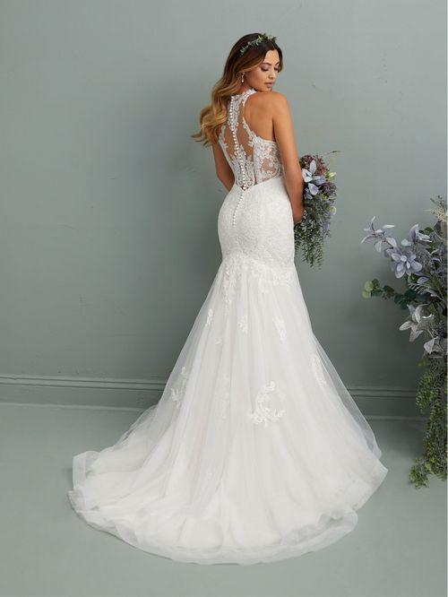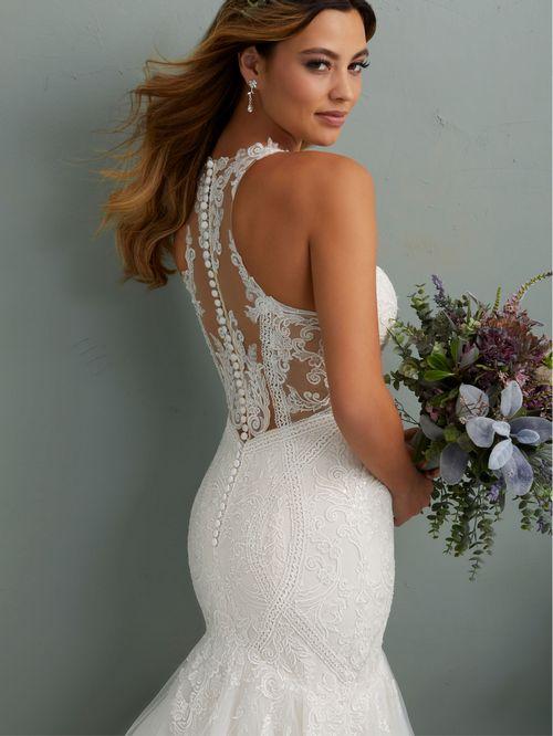 Description: As unique as the bride who wears it, this fitted halter dress in patterned lace offers impeccable style. This mermaid style features a plunging V-neckline, sheer lace side cutouts leading to a racerback adorned with lace appliques and covered buttons.