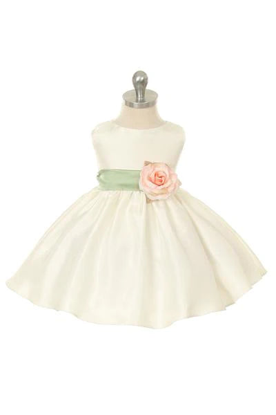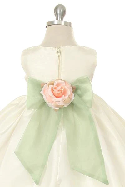 This lovely ivory silk girl's dress is embellished with a ribbon at the waist, decorated with beautiful burgundy flowers. An elegant dress that will bring charm and sophistication to your child. Wrapped in the softness of ivory and the bright contrast of the floral ribbon, your daughter will feel like a princess.