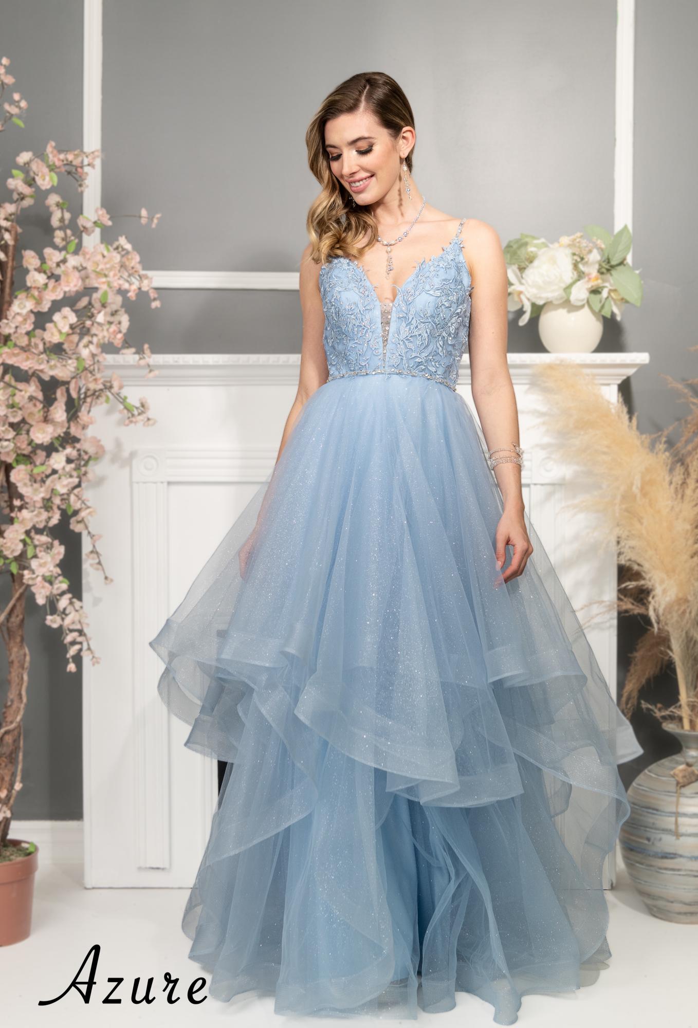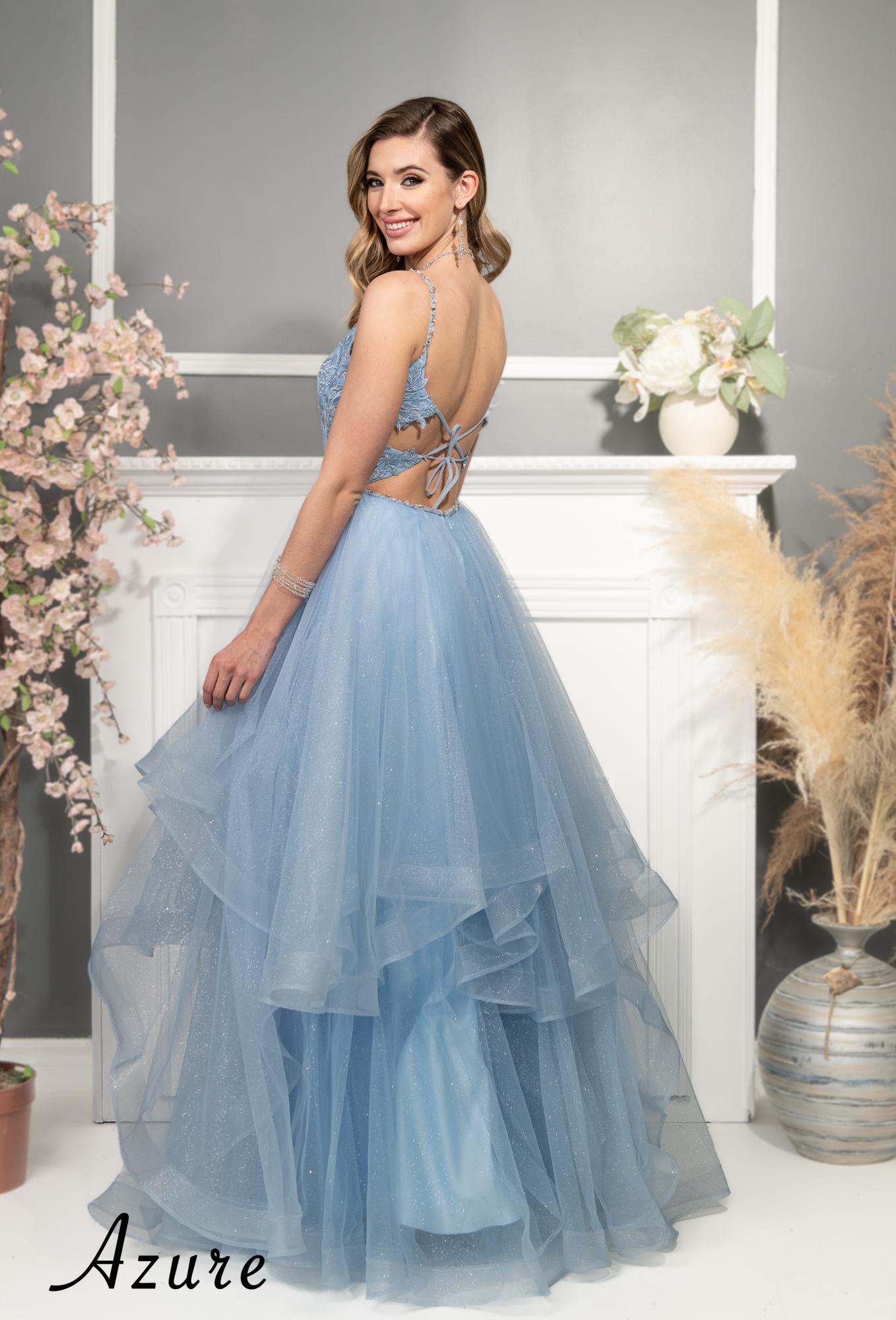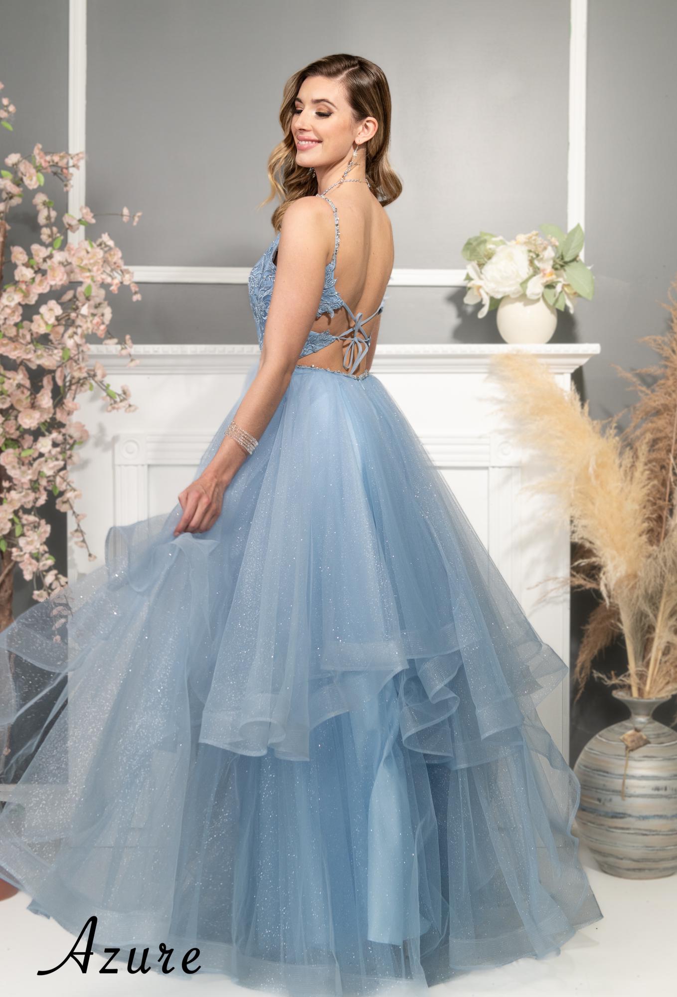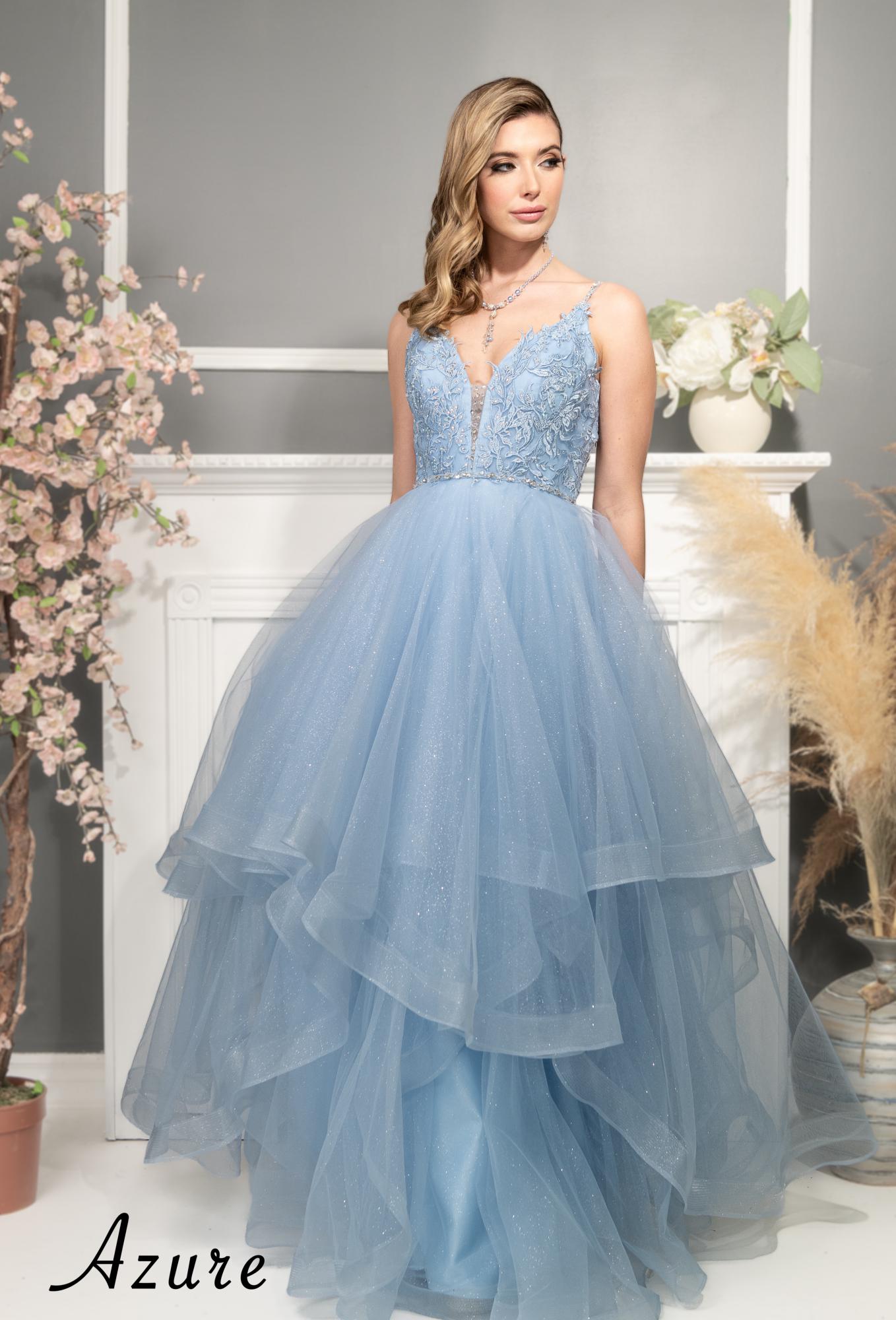 Discover the elegant charm of the Roxanne dress in pale blue. With its lace top and open lace-up back, this tiered tulle princess dress will make you feel like a true princess. Add a touch of luxury to your wardrobe with Roxanne.