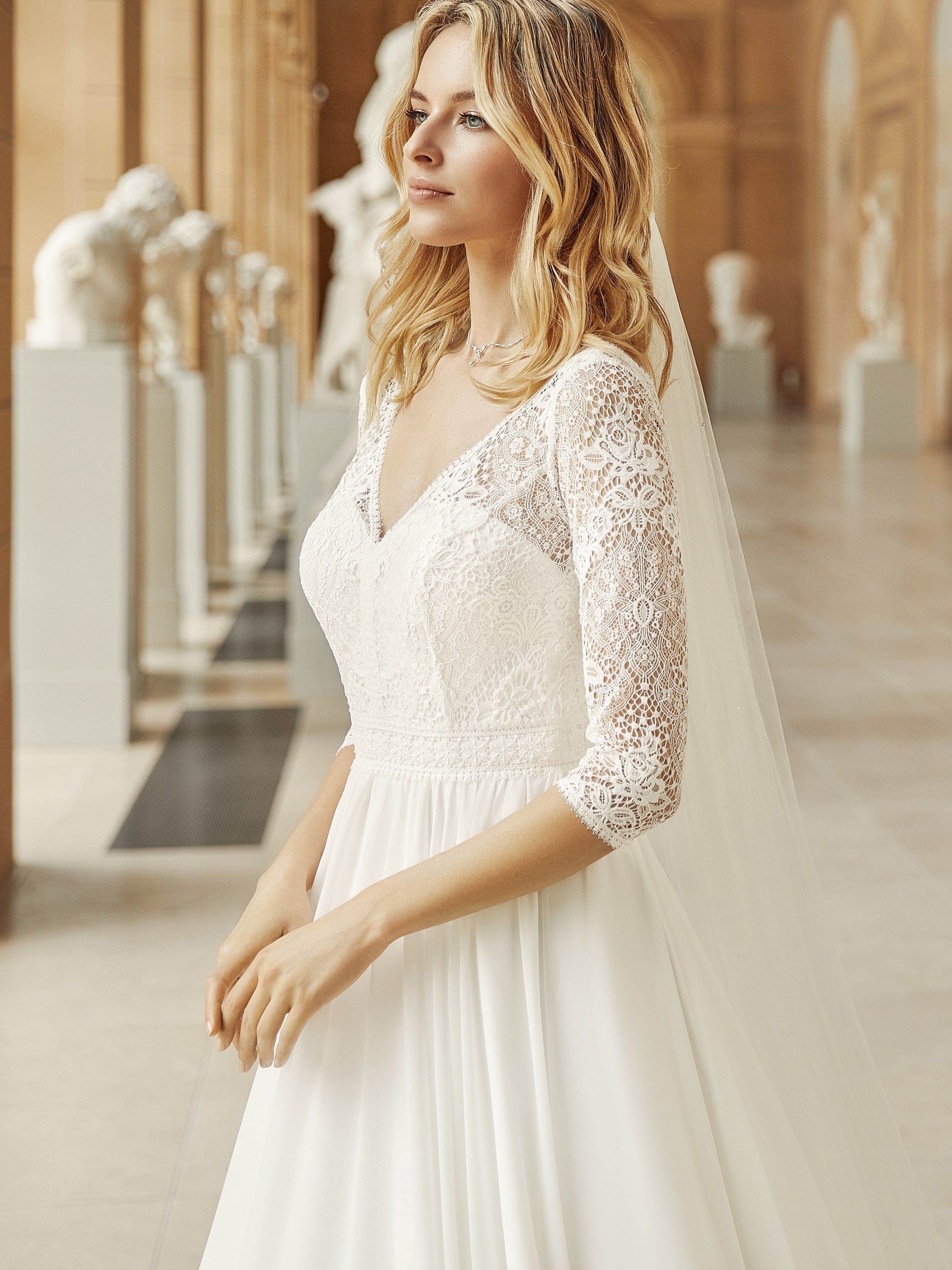 Vestido de novia corte A, con manga 3/4, en encaje y gasa de alta calidad. |
