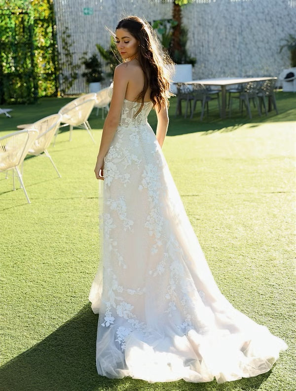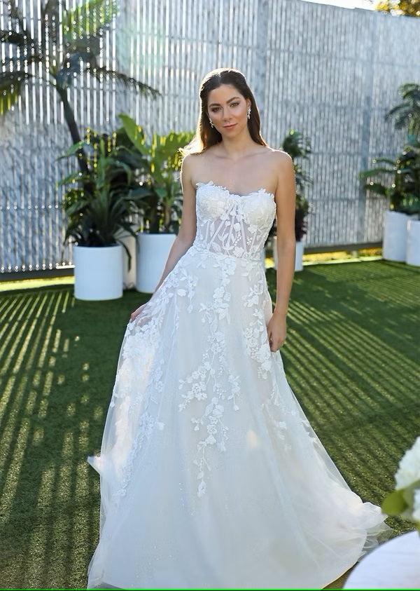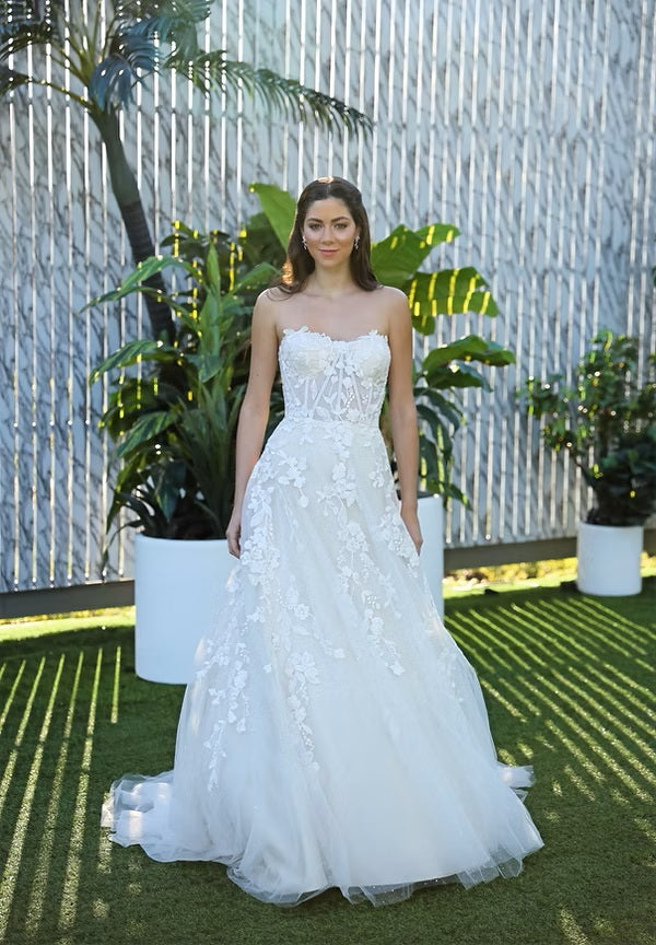 Descripción: Una visión de la perfección, el vestido Maïka te encantará con su corpiño de encaje y sus brillantes lentejuelas. El corte cónico y los detalles de los botones añaden un toque de sofisticación y glamour, mientras que la gran cola de lentejuelas le dará una gran entrada a su evento de boda. Una maravilla, vestida para seducir.