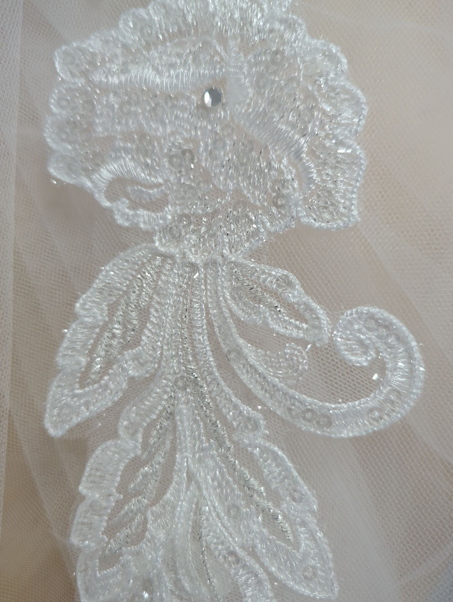 Le voile BV676DW est un choix somptueux pour les mariées en quête d’un accessoire délicat et luxueux. Confectionné en tulle fin, ce voile est orné d'appliqués floraux richement perlés et rehaussés de sequins subtils. Chaque motif brodé capte délicatement la lumière, ajoutant un éclat raffiné à votre silhouette.
