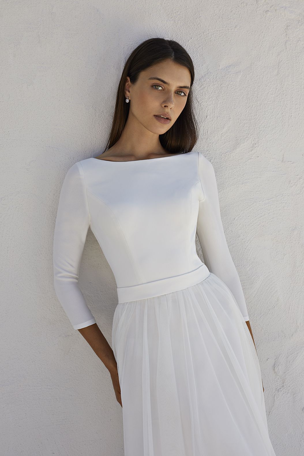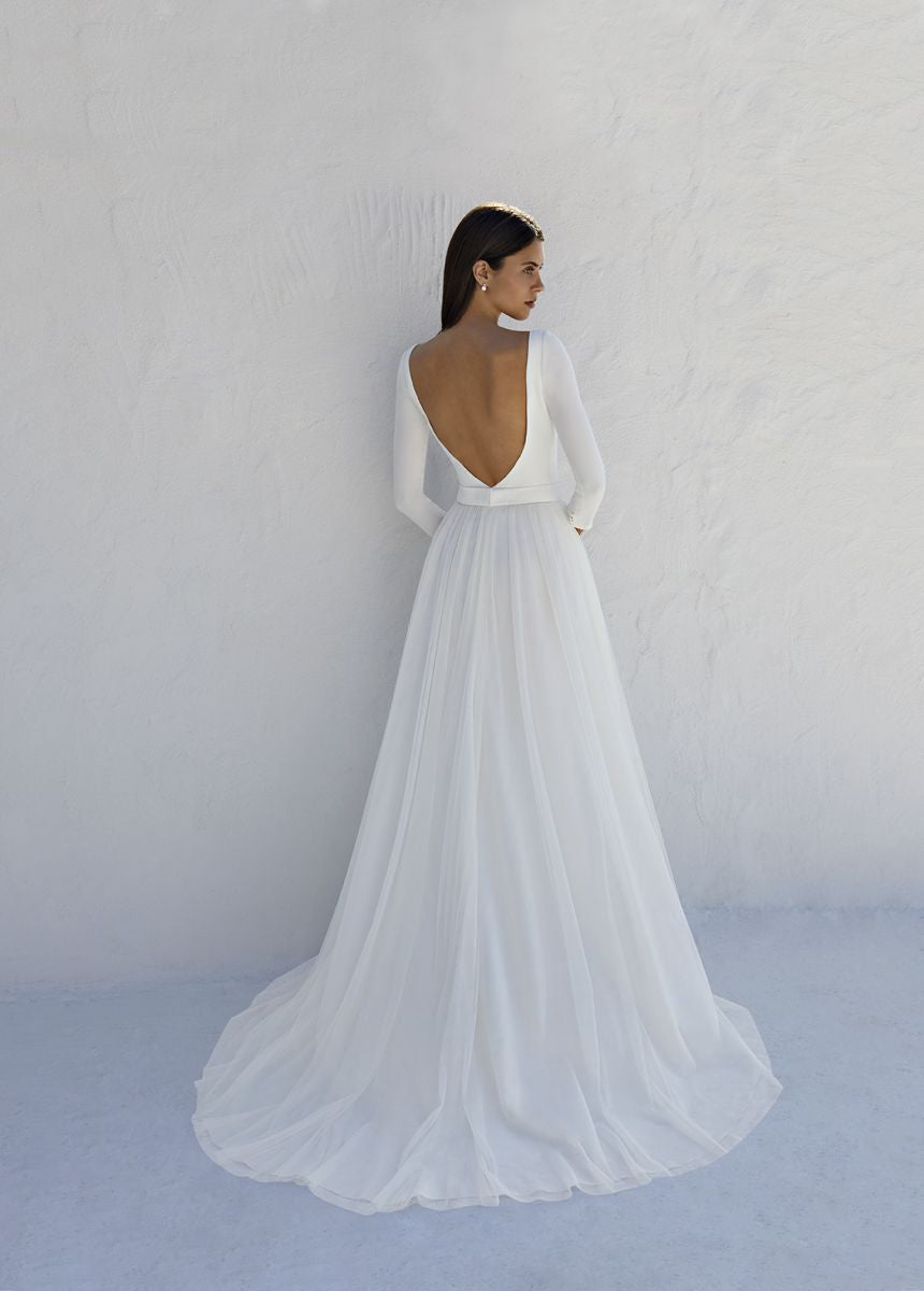 Descripción: Un corpiño de crepé con escote barco y una lujosa falda de princesa crean este sofisticado vestido de tul con mangas tres cuartos y una seductora espalda escotada.