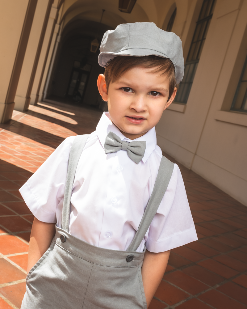 Destaca con el conjunto Eton gris pálido, que incluye traje, camisa blanca de manga corta y accesorios a juego. Disponible en tallas 1 a 4, este look sofisticado y elegante es perfecto para cualquier ocasión especial. Añade un toque de lujo con los tirantes, el capó y el lazo en gris pálido.