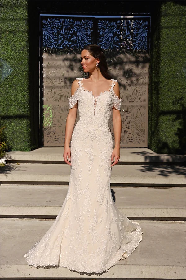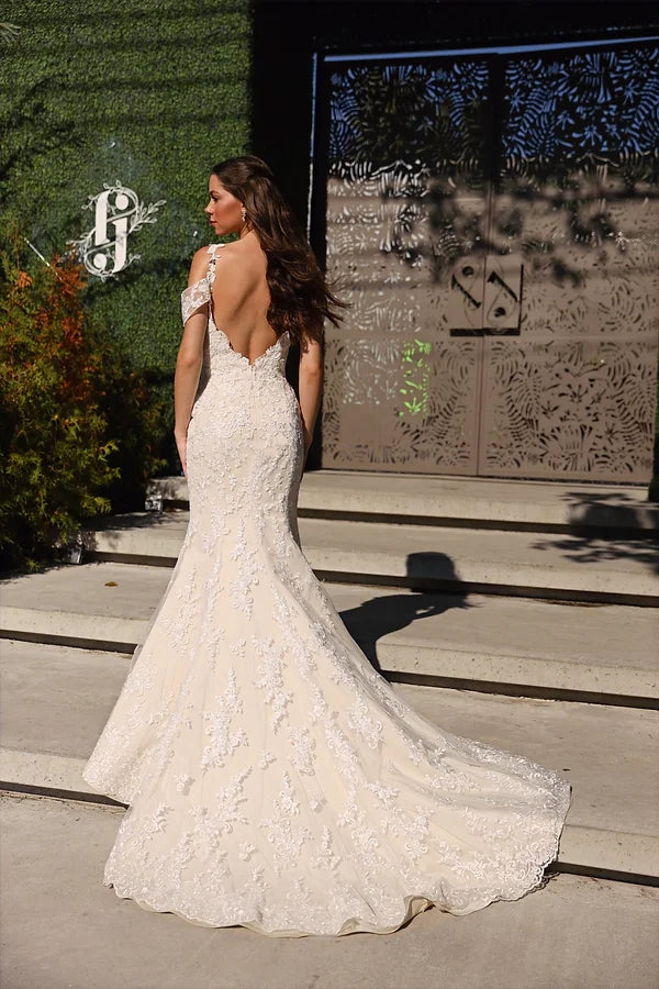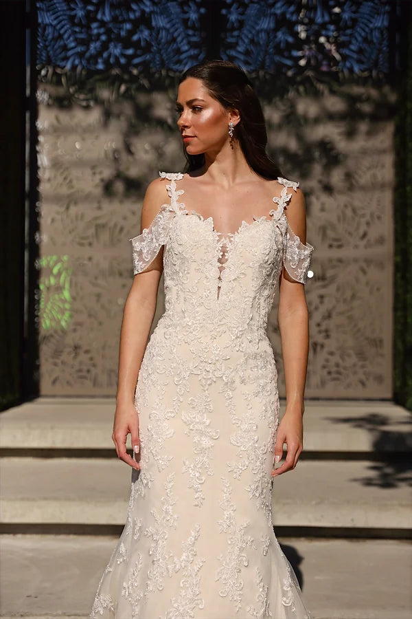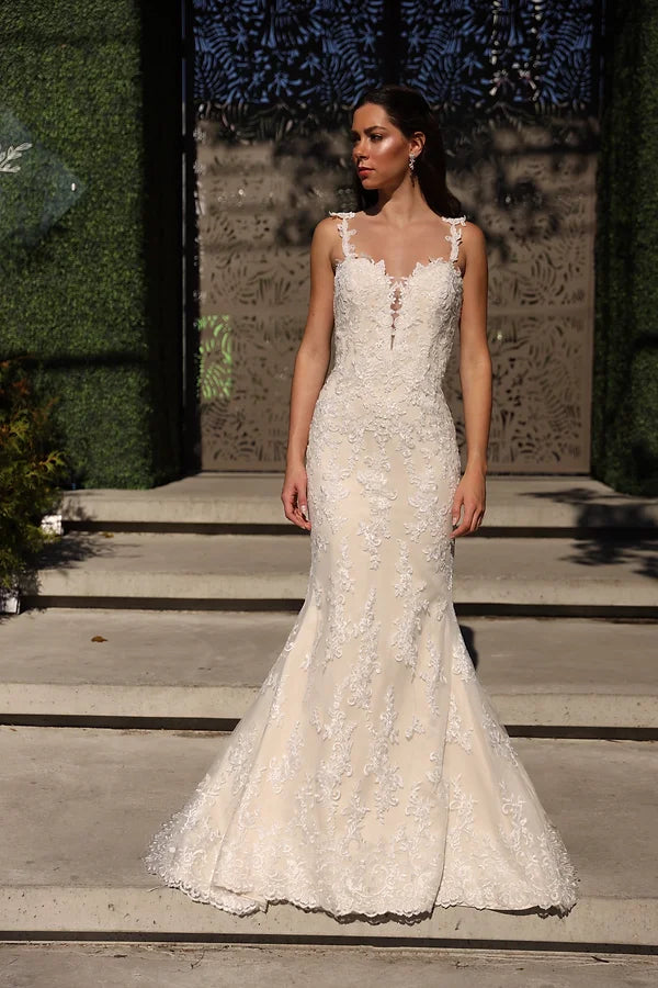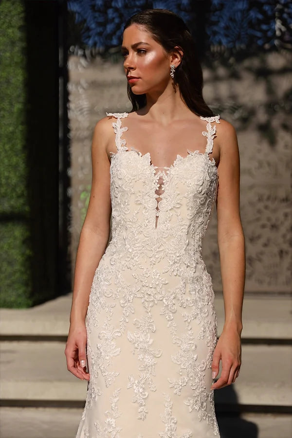 Delicado patrón de encaje en todo el vestido, capa de tul removible con encaje a juego, mostrado con y sin tirantes removibles, panel transparente en el corpiño central, botones que acentúan la parte posterior del vestido, vestido también disponible sin capa de tul removible |