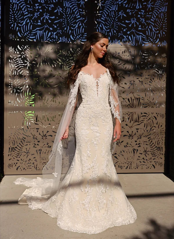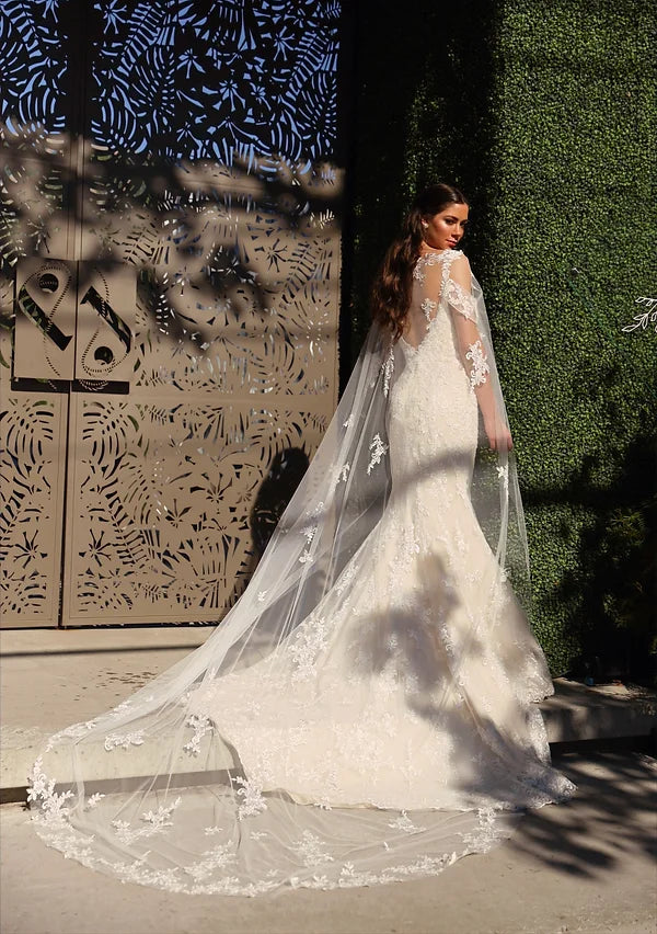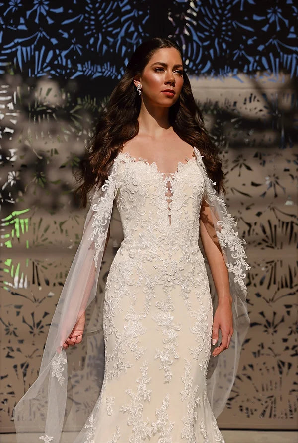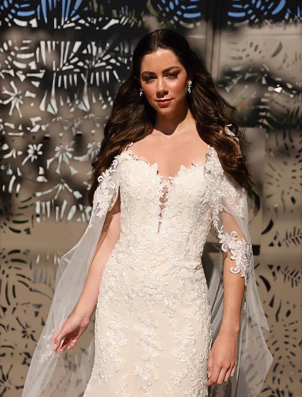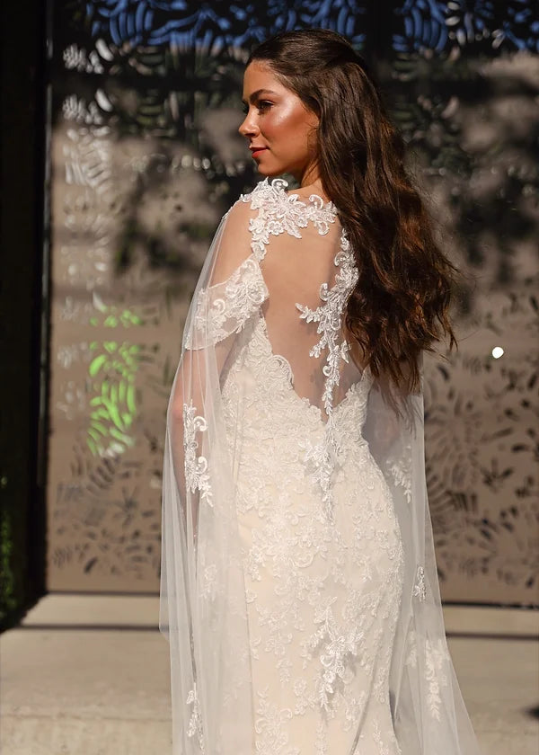 Descripción: Con la capa hace todo un efecto. También es posible quitárselo y conservar toda la belleza del vestido gracias a su encaje que se despliega por todo el vestido. Sin olvidar sus mangas caídas extraíbles.