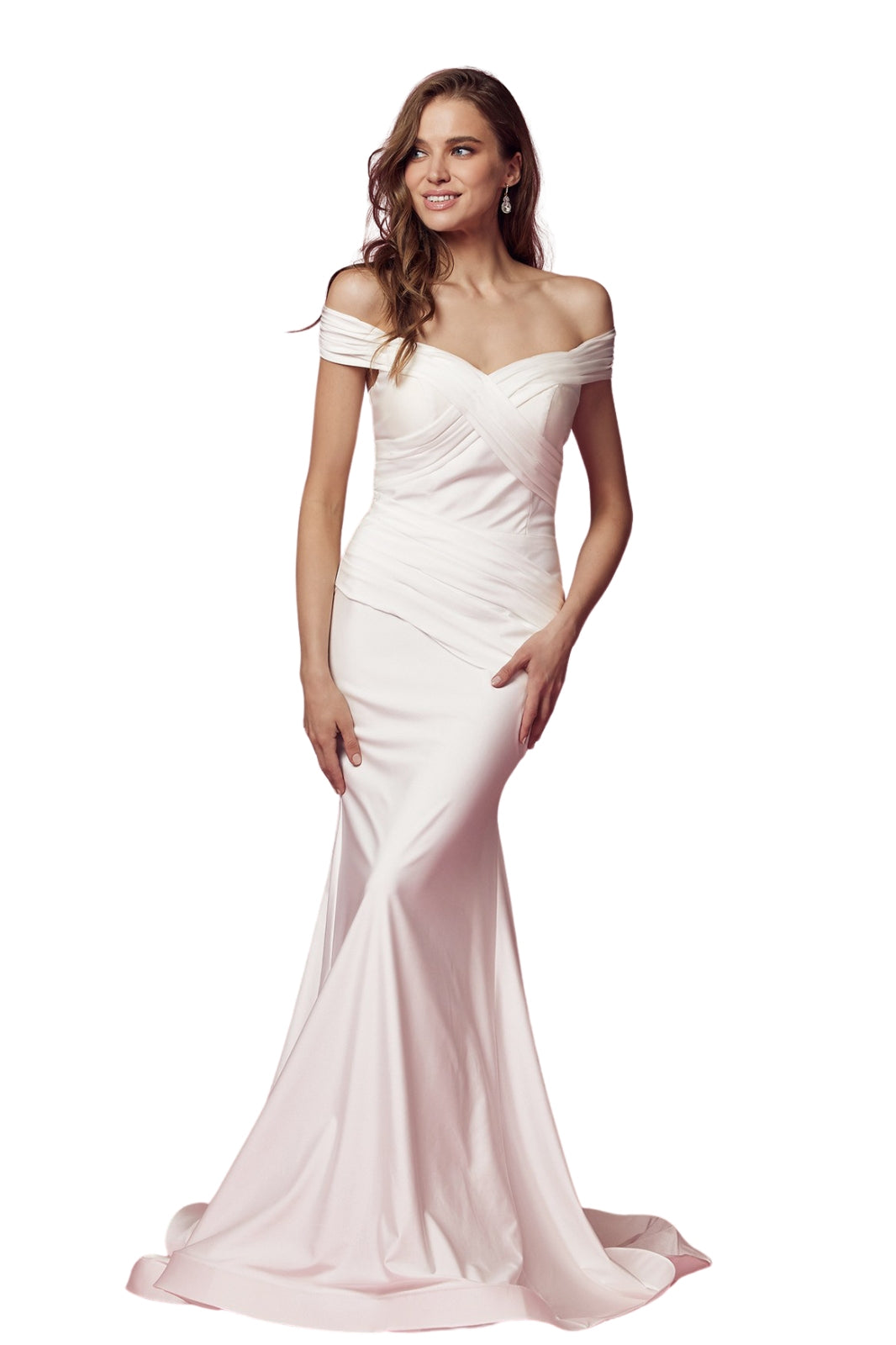 El vestido Nox Anabel E497W es un elegante vestido de novia sirena, diseñado para realzar la silueta con sofisticación. Se distingue por su escote corazón drapeado y sus hombros descubiertos, ofreciendo un look romántico y moderno.