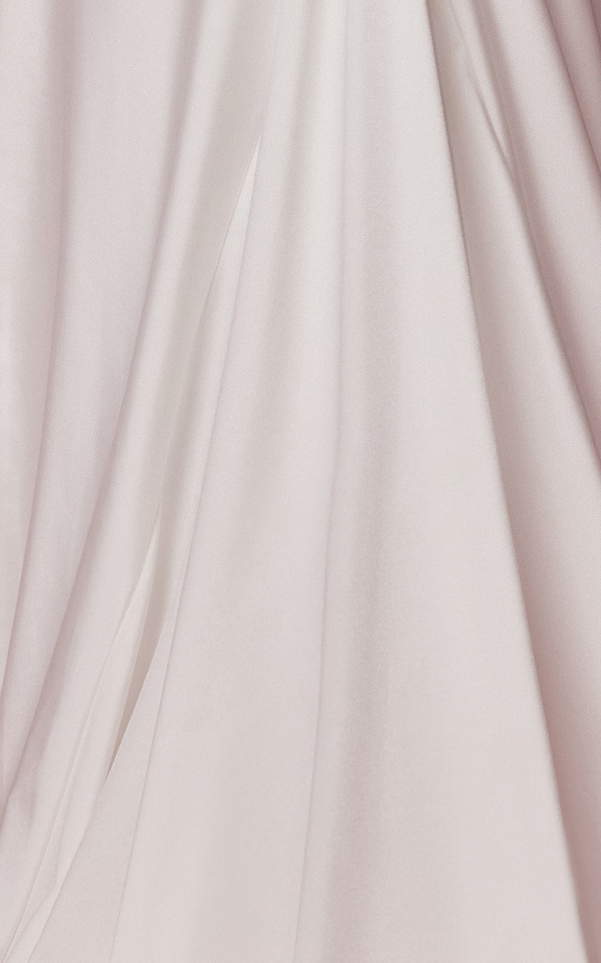 - Escote: Escote corazón drapeado con hombros descubiertos, aportando un toque de sensualidad.