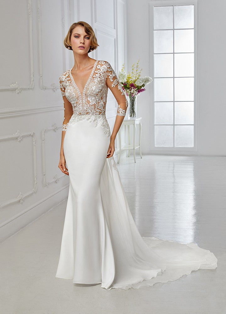 Descripción: El seductor encaje bordado embellece el corpiño y las mangas largas de este sensual vestido de crepé, ajustado y con vuelo, con un pronunciado escote en V, espalda transparente y cola de organza desmontable.