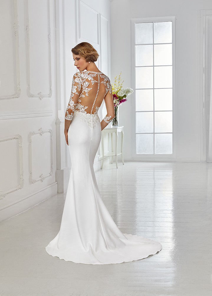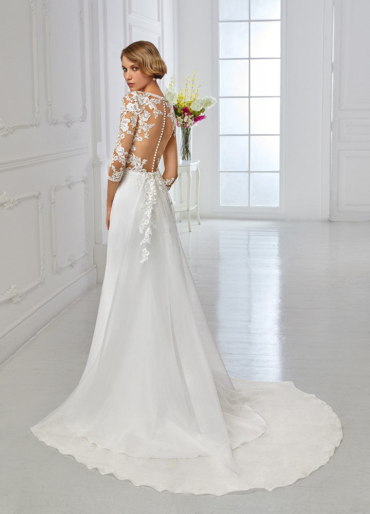 Busto y mangas todo en encaje, espalda con una bonita línea de botones, falda sencilla y sofisticada. |