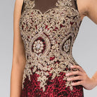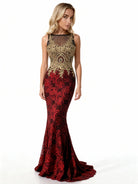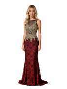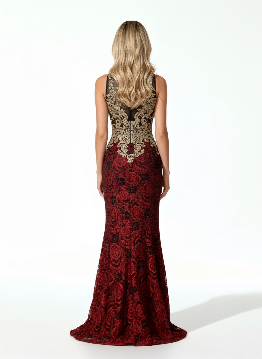 Vestido largo escarlata con bordado dorado
