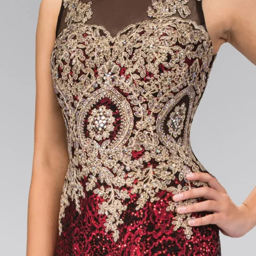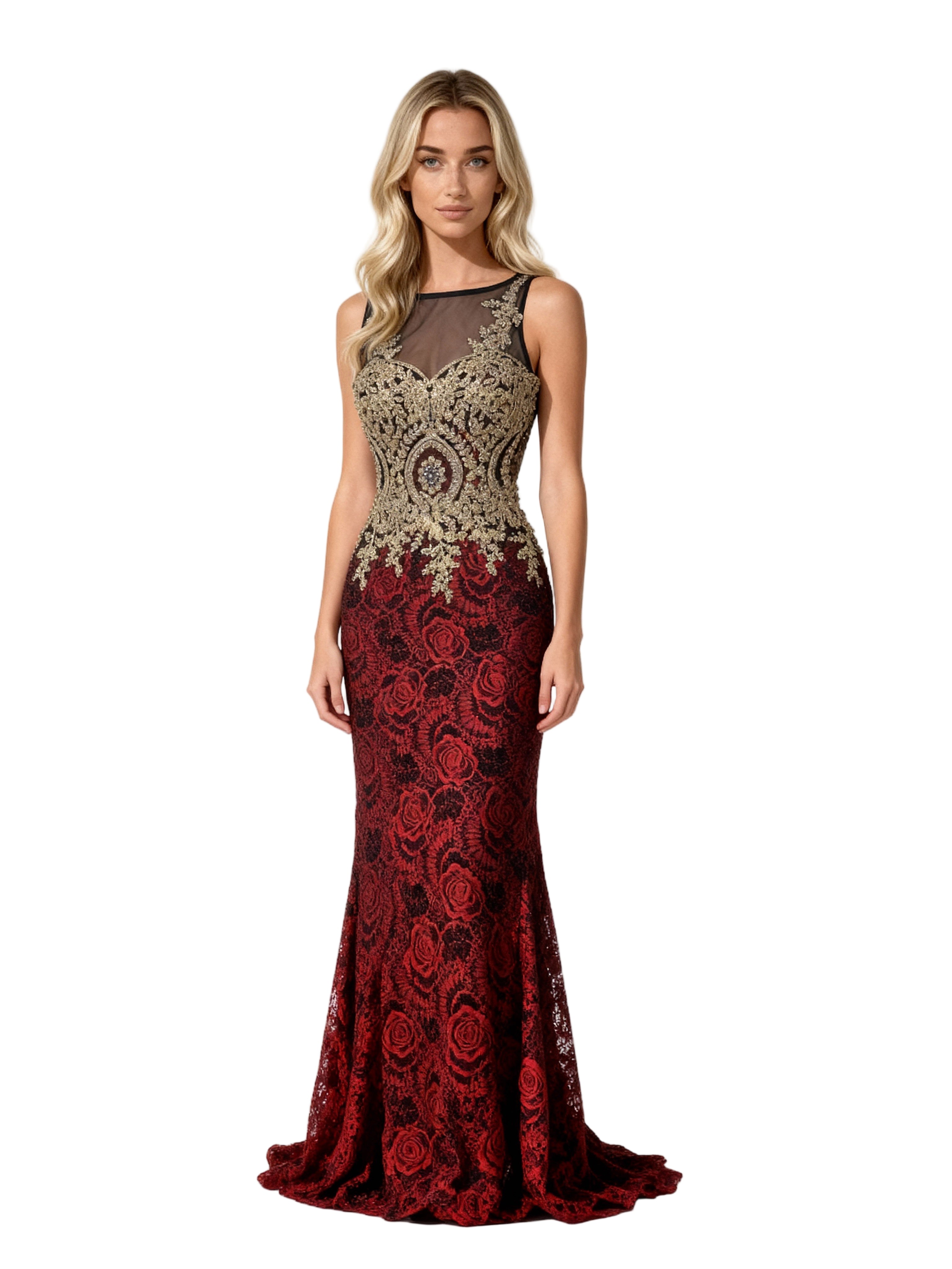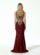 Este suntuoso vestido largo combina un refinado bordado dorado con un fondo escarlata ricamente decorado con motivos florales de lentejuelas. La parte superior ilusión negra añade un toque de misterio y elegancia, mientras que el bordado dorado en el busto crea un contraste sorprendente. Con un corte entallado, este vestido se adapta a las formas para crear una silueta elegante y esbelta.