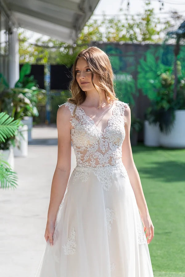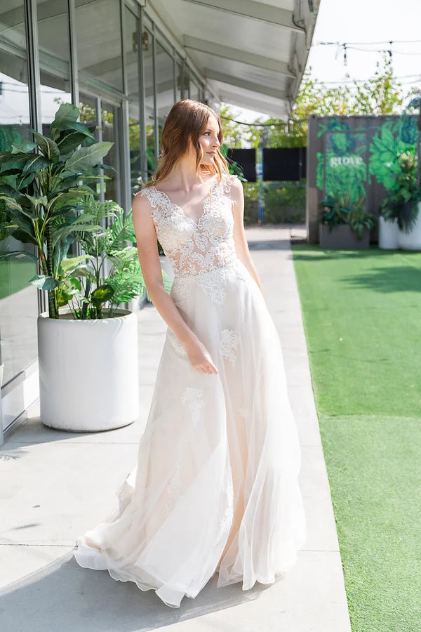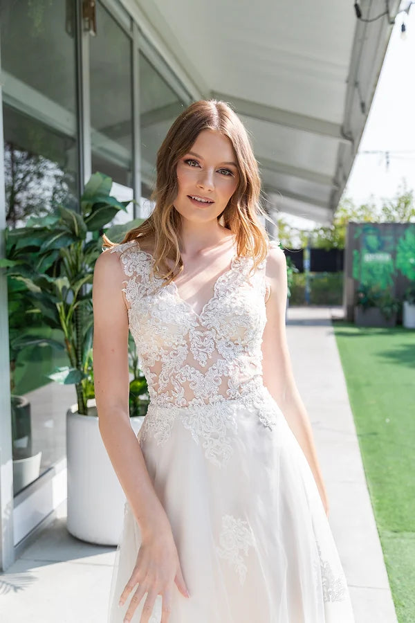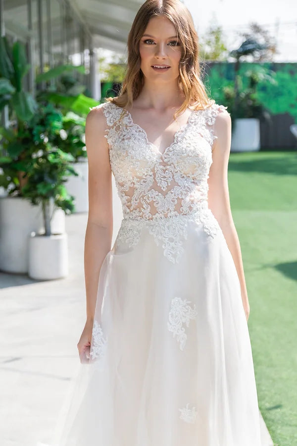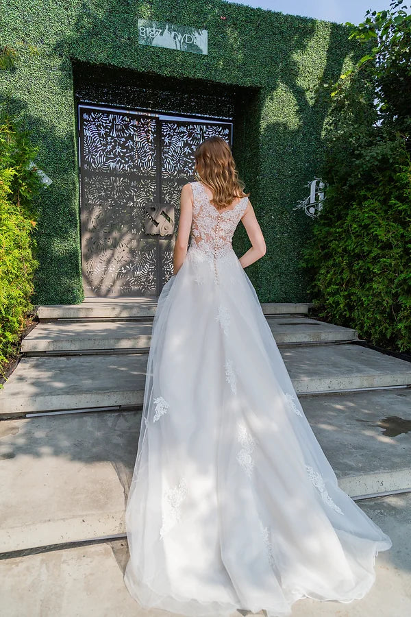 Descripción: El tul ligero y el encaje de inspiración floral se combinan para crear un look clásico verdaderamente único. El detallado corpiño semitransparente ofrece un favorecedor escote en V enmarcado por amplios tirantes de encaje con pedrería, que conducen a una ilusión de encaje en la espalda con botones para mayor romance. El encaje fluye sin esfuerzo a lo largo de la falda y la cola para una apariencia romántica de ensueño** Se muestra en marfil/rosa ron**