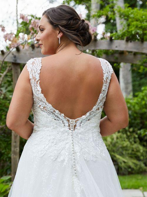 Descripción: Una silueta llamativa con corpiño de encaje y tirantes de encaje transparente. La falda y la cola de tul con lentejuelas añaden más detalles a este vestido de corte A. Su magia reside en la sencillez del corte.
