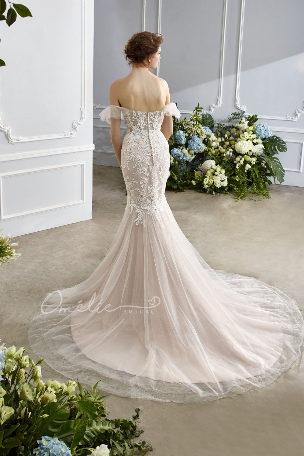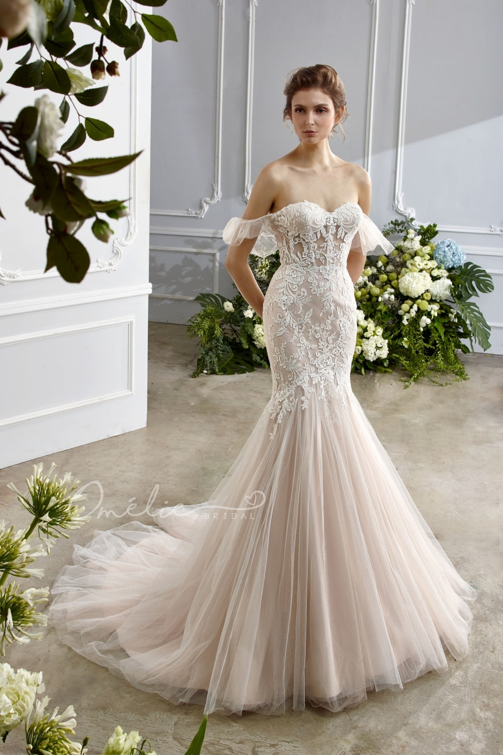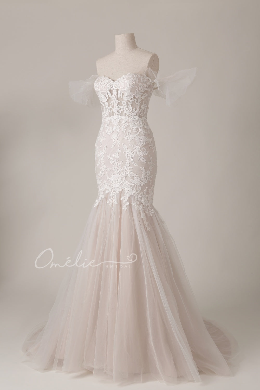 Descripción: Vestido de novia de corte corsé y vuelo en tul. escote corazón,
