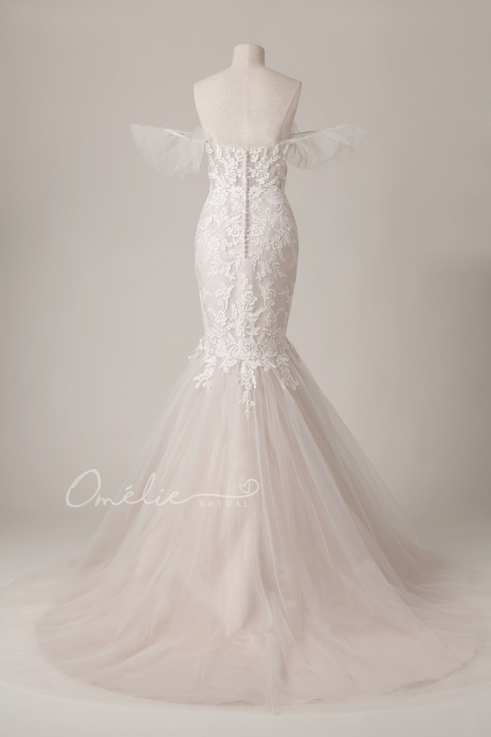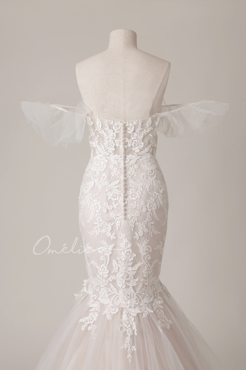 Vestido todo de encaje hasta la rodilla y tul hasta la cola. Mangas removibles, espalda con cierre de botón. |