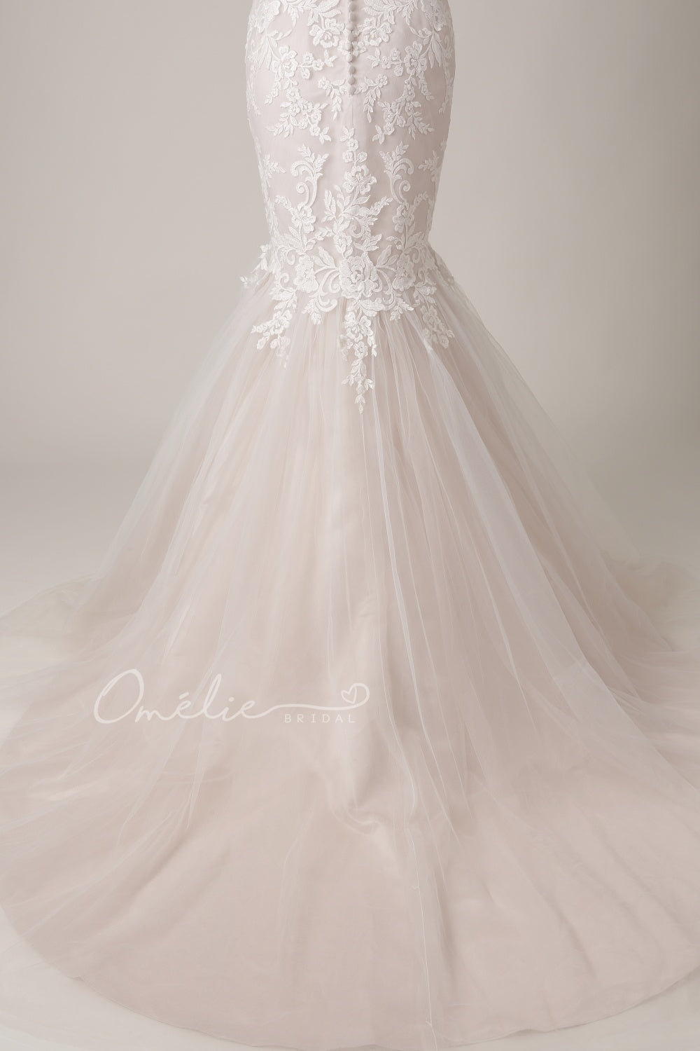 Corpiño transparente con decoración. Apliques de encaje floral colocados en todo el corpiño hasta la rodilla, falda de tul con forro de satén, botones forrados de tela en la cremallera.