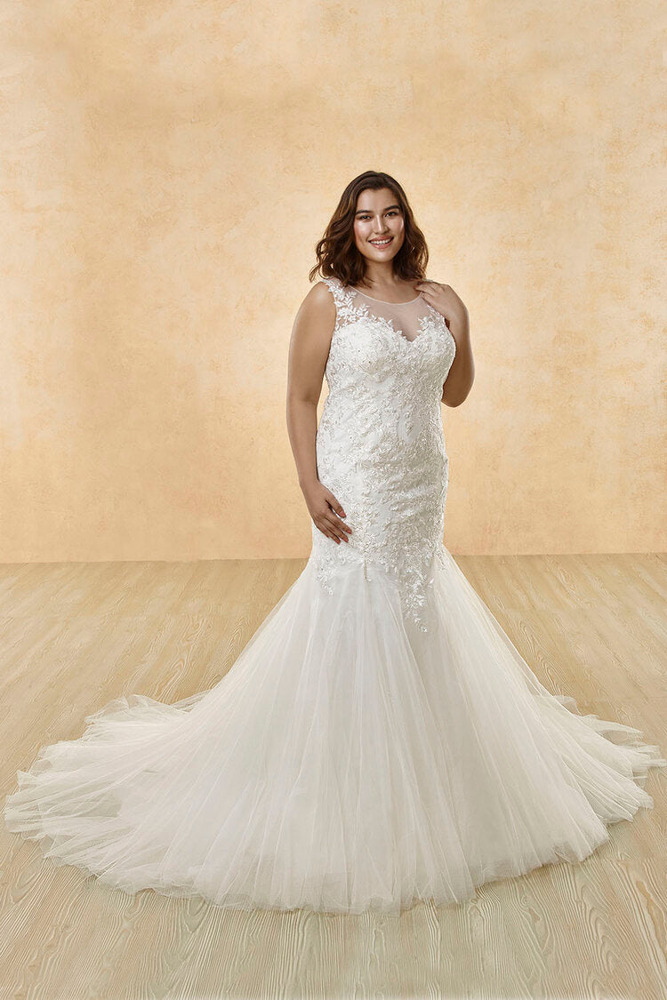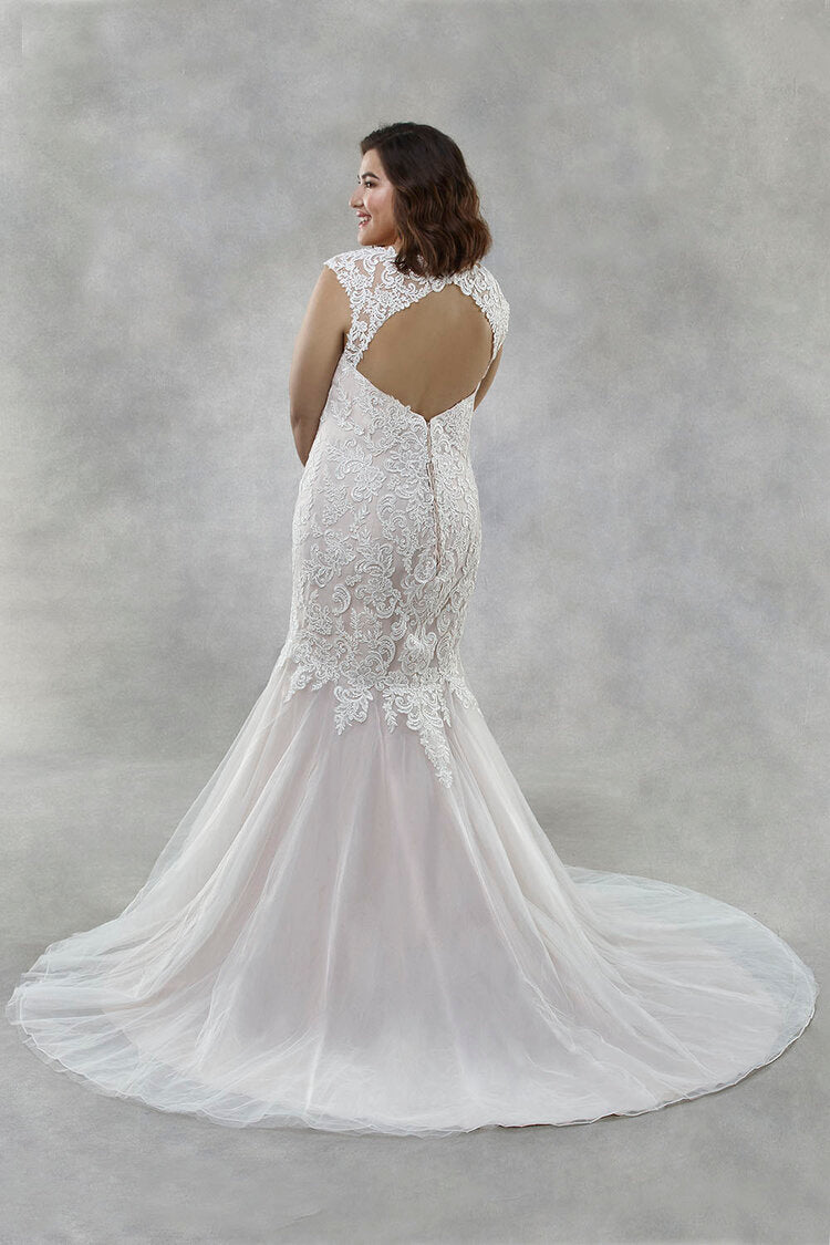 Descripción: Vestido sirena con escote corazón ilusión. Espalda de encaje ilusión con abertura. Cordones adornados con abalorios artesanales hechos a mano. Cierre de cordones en la espalda.