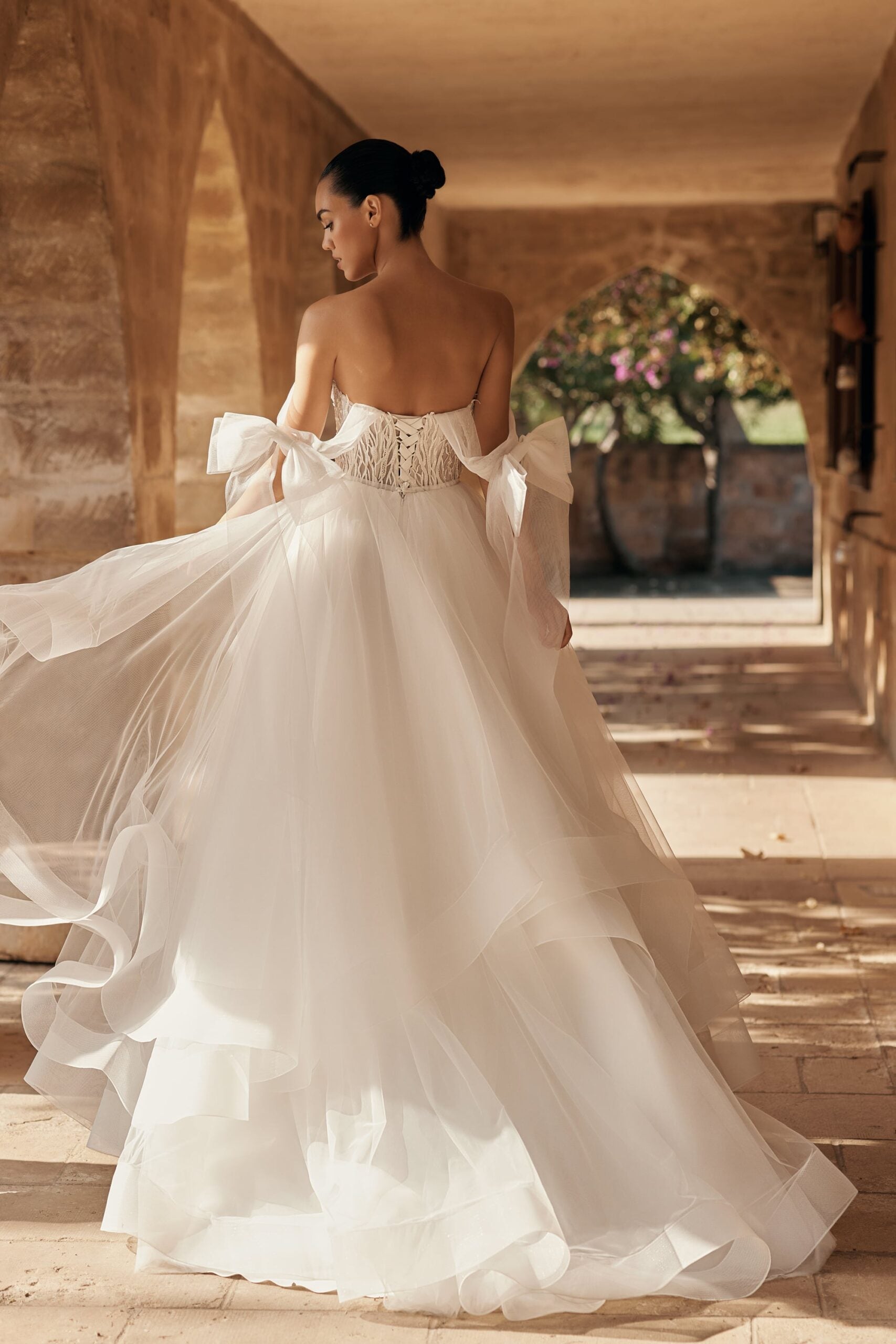 Combina este vestido con un delicado collar y aretes de perlas para una apariencia atemporal. Un moño elegante resaltará los detalles de las mangas caídas y la espalda con cordones.