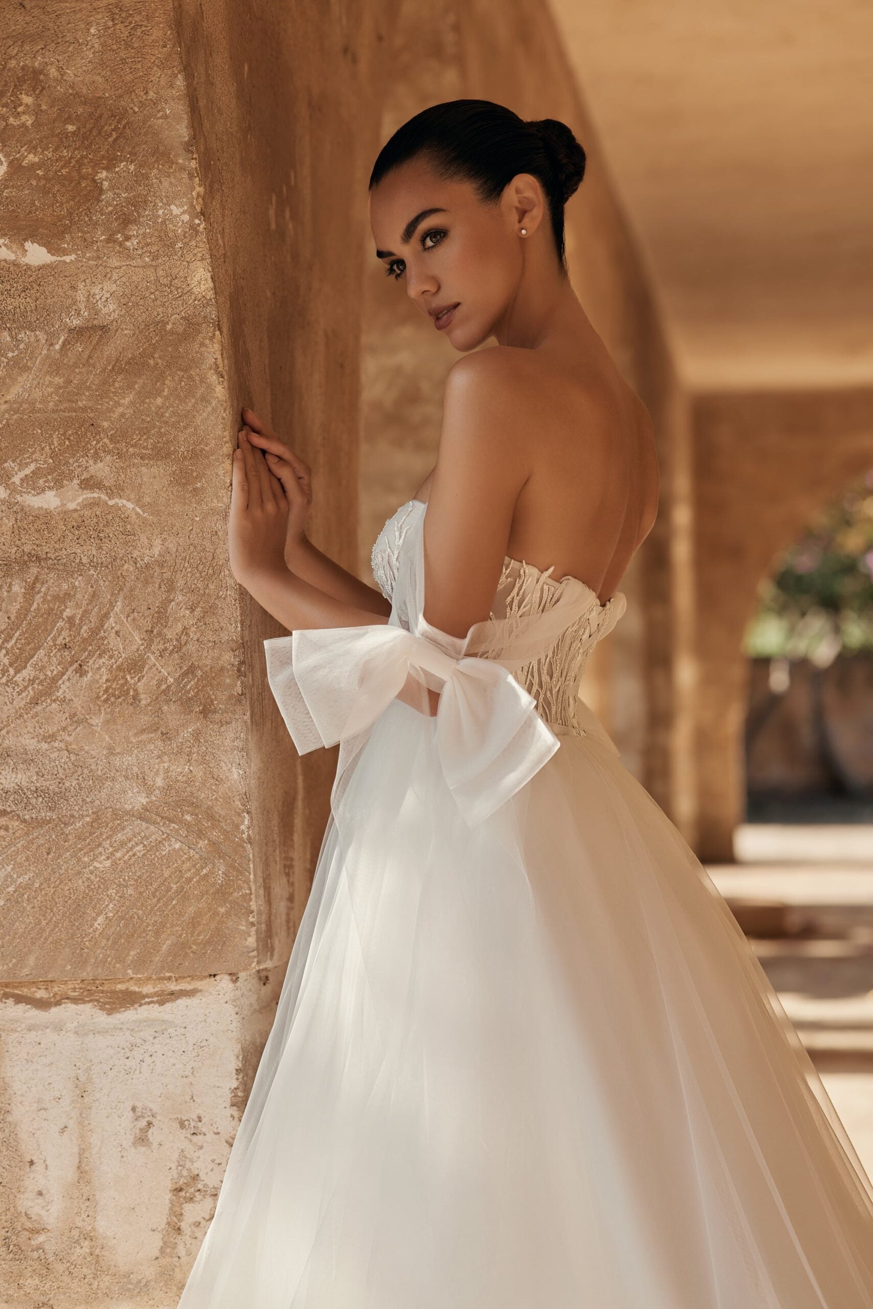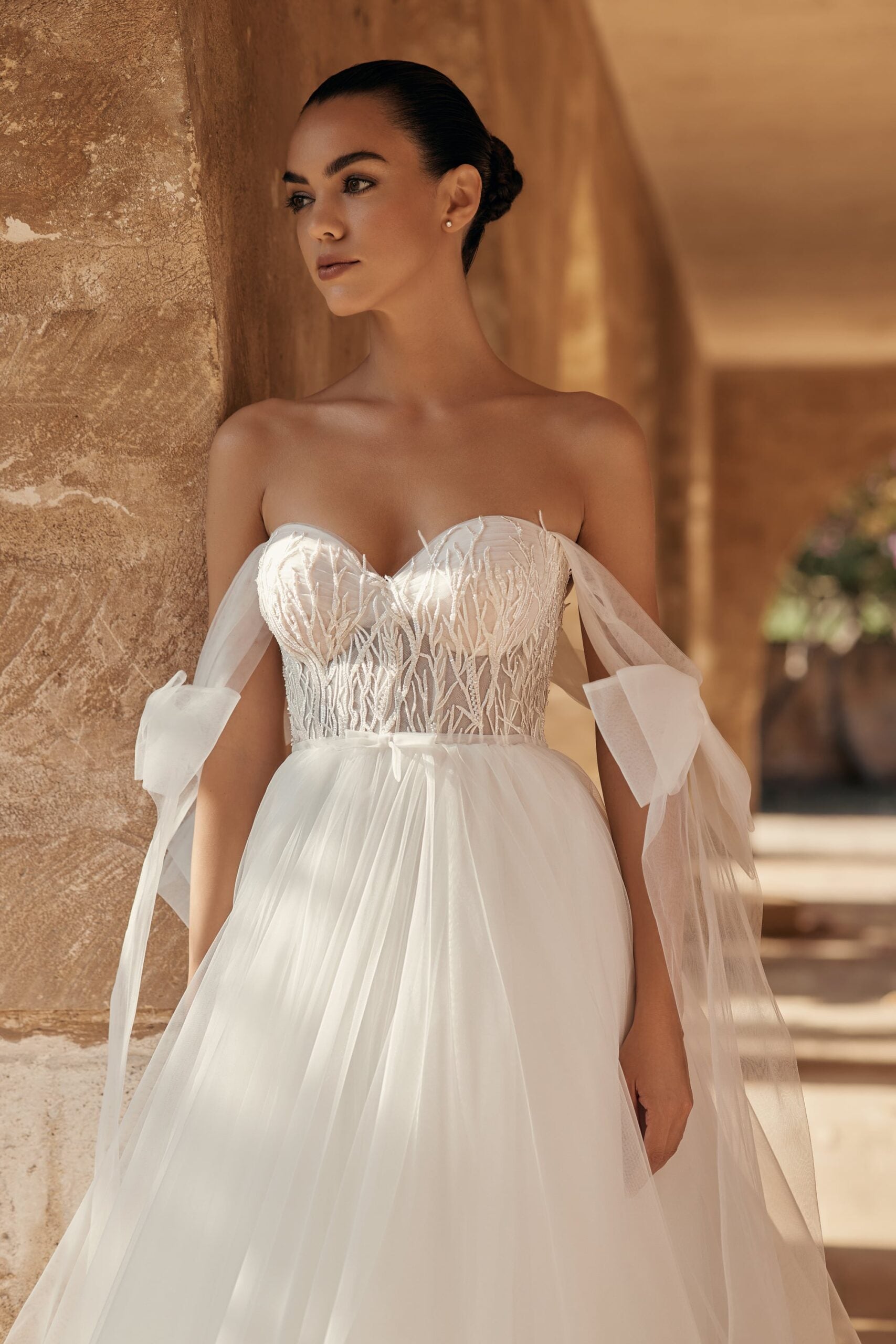 Este majestuoso vestido de novia destaca por su cuerpo bordado con un sutil estampado, ofreciendo una mezcla perfecta de elegancia y modernidad. Las mangas caídas de tul transparente añaden un toque romántico y delicado, mientras que la voluminosa falda de tul garantiza una silueta majestuosa. El corpiño en forma de corazón y los detalles bordados crean un look sofisticado para una novia que busca tradición y glamour al mismo tiempo.