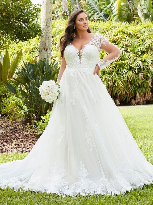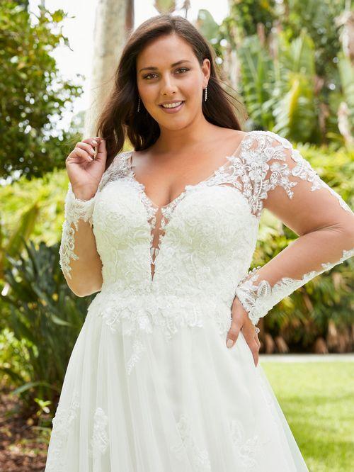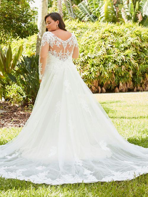 Descripción: La elegancia atemporal dice mucho en este vestido transparente de manga larga. Las aplicaciones de perlas realzan el escote pronunciado. El tul transparente y la espalda de encaje dan paso a una cola con bordes transparentes y completan este look clásico.