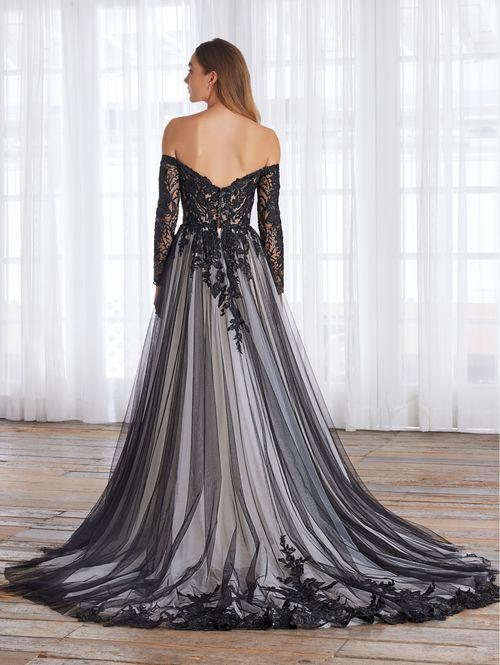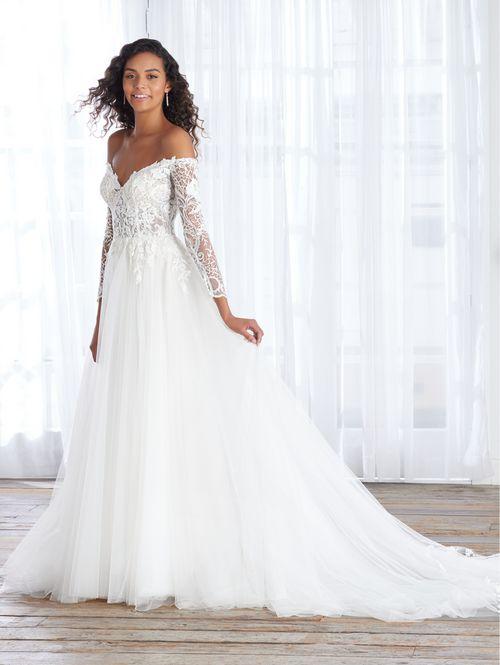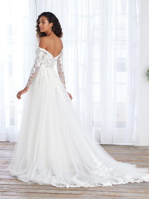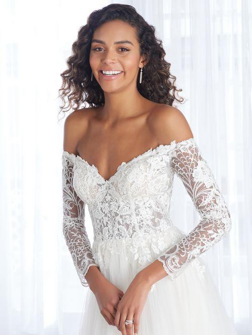 Descripción: Un vestido de tul suave y encaje floral hecho para la novia romántica. El corpiño con cuello en V y hombros descubiertos tiene un glamour innegable. Elegantes senderos de encaje floral en la cintura y mangas largas radiantes. Una falda fluida de tul completo completa el look con detalles de encaje.