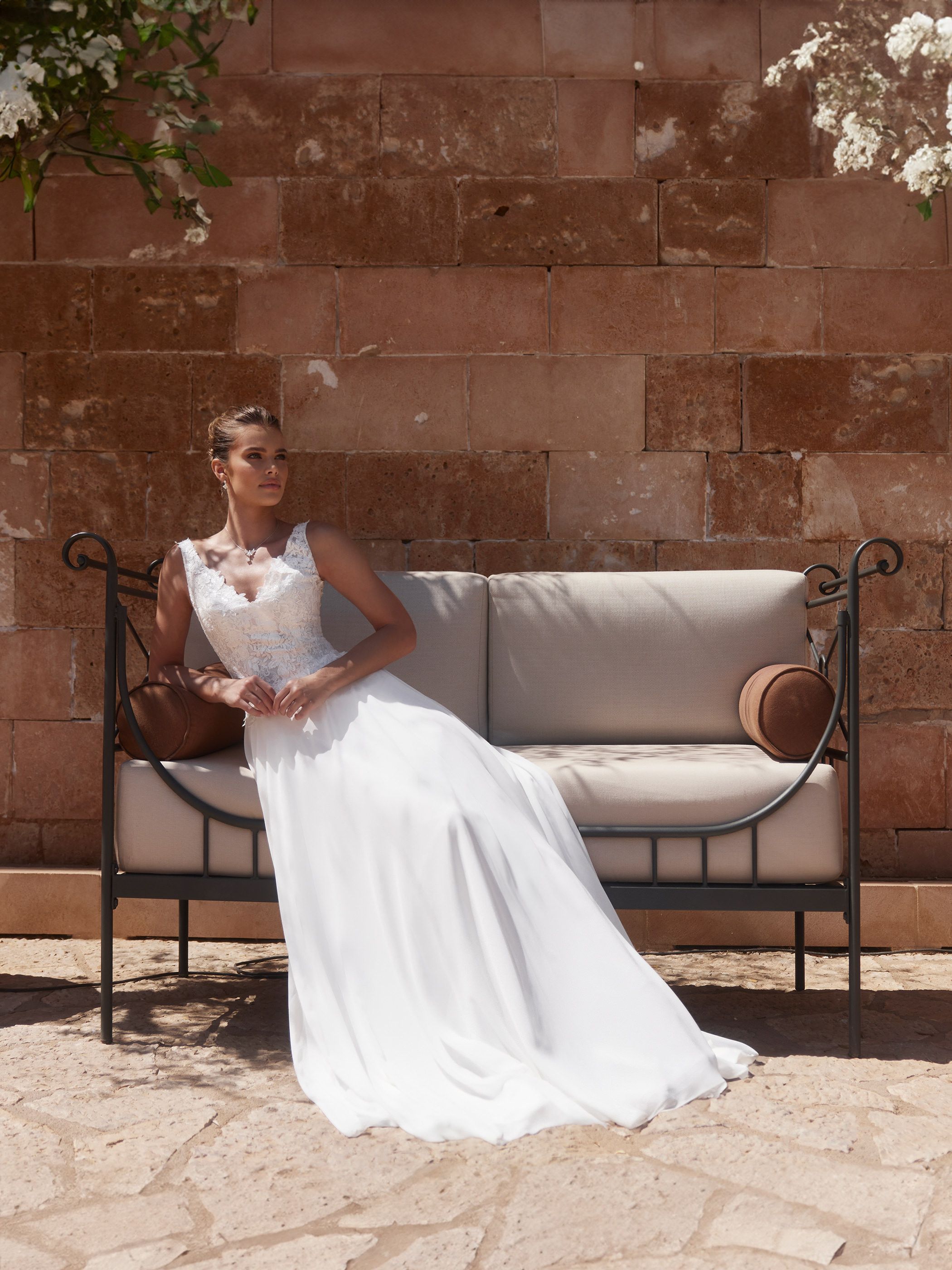 Associez-la avec un voile simple et fluide pour accentuer son côté intemporel, ou optez pour des bijoux discrets en argent ou en perles pour souligner la finesse du bustier. Une coiffure relevée mettra parfaitement en valeur le dos nu et le décolleté plongeant.