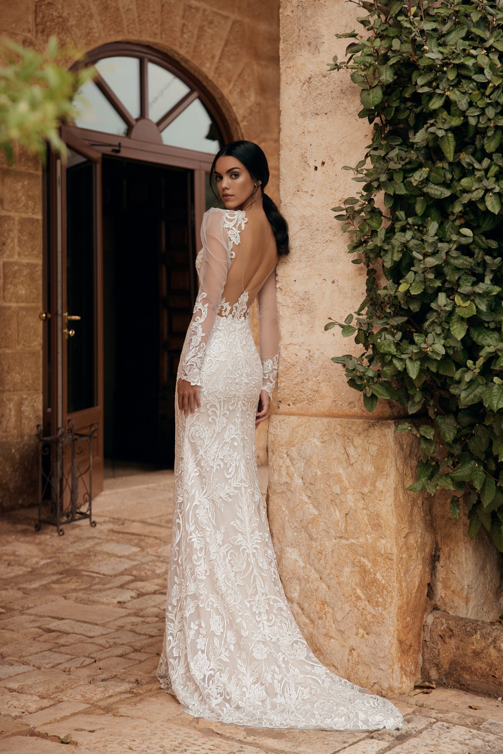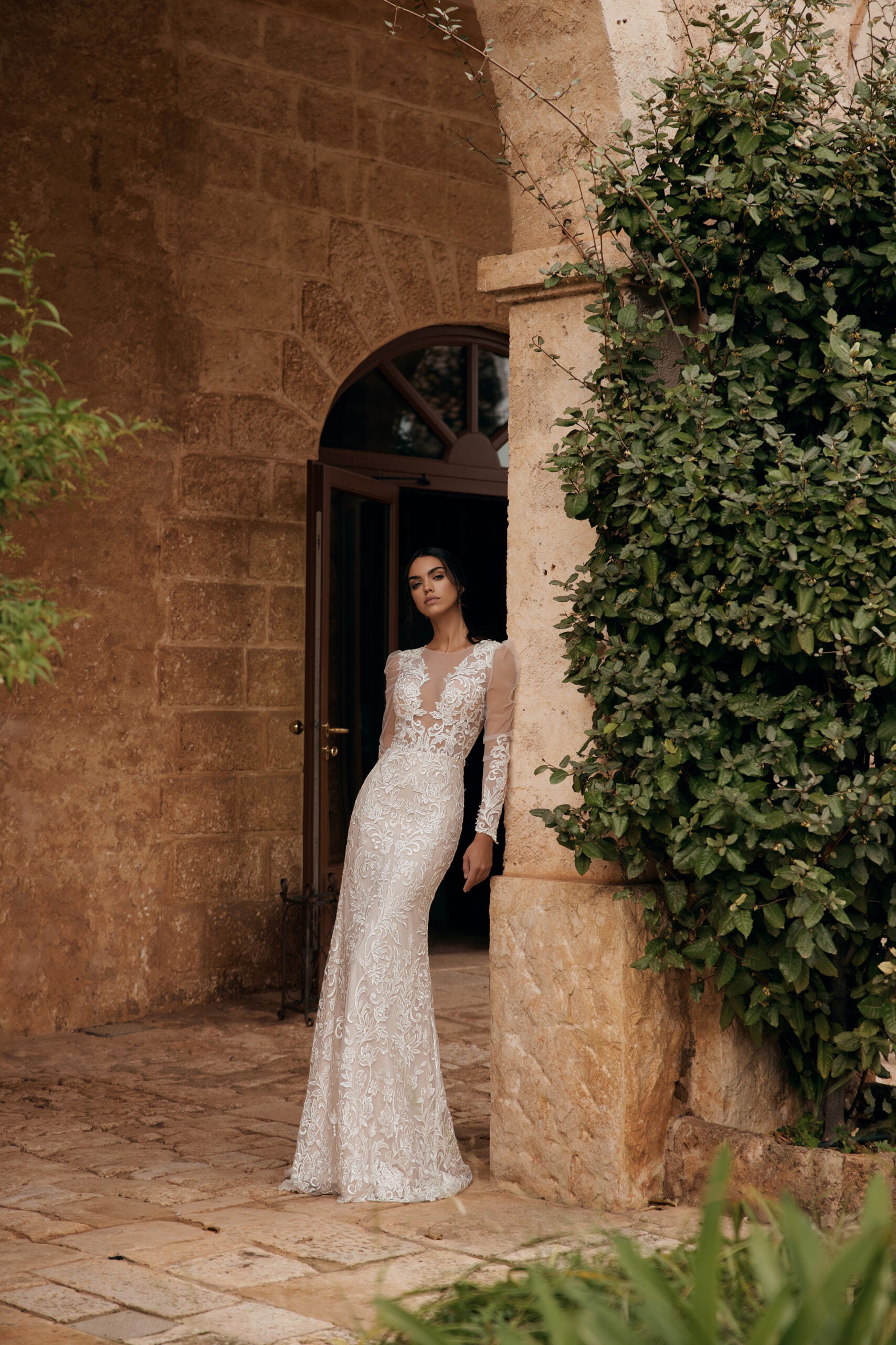 Detalles: Mangas largas transparentes bordadas, corpiño ajustado con cinturón, cola elegante