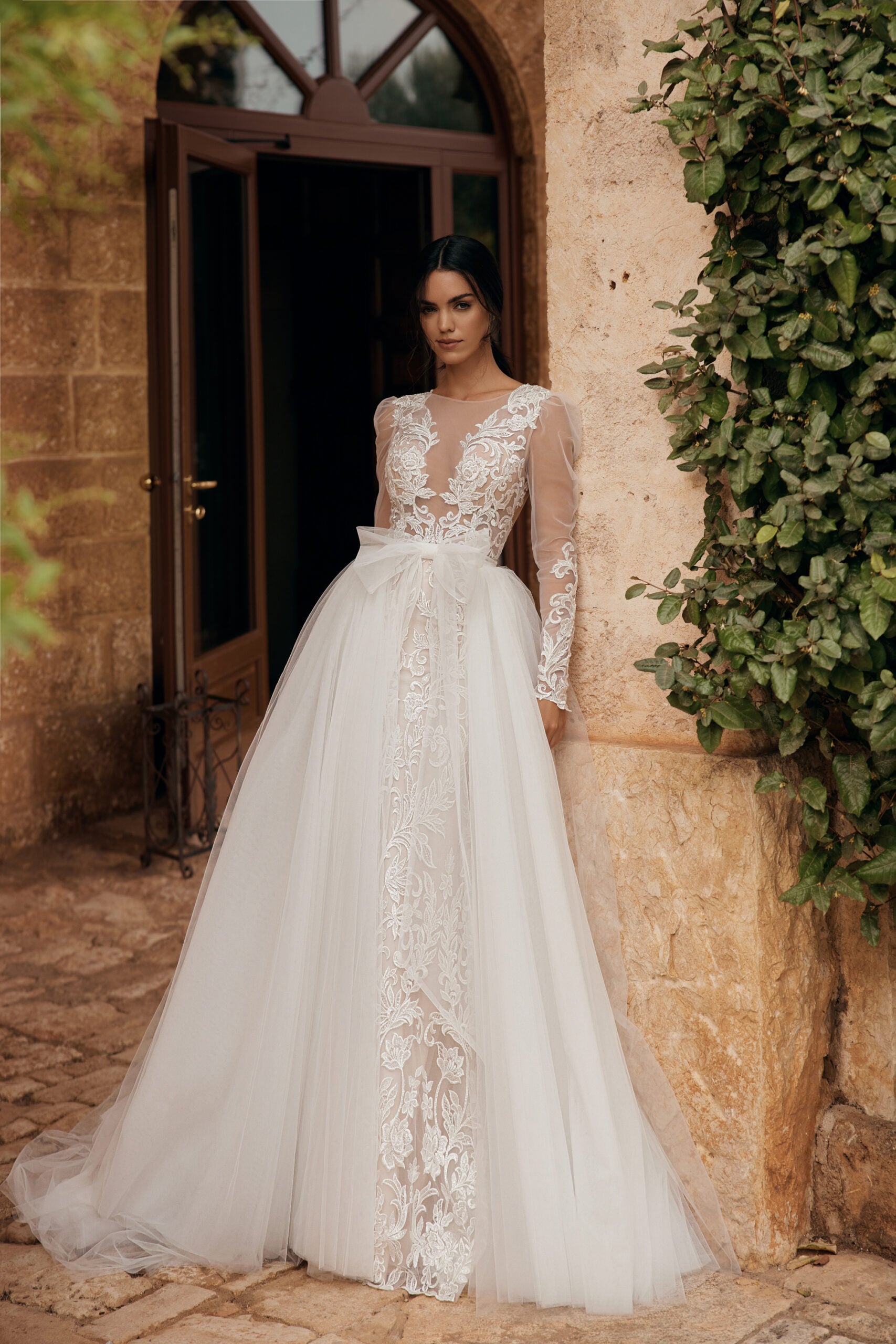 El vestido de novia Daniela es la encarnación perfecta de la elegancia clásica con un toque moderno. Sus mangas largas transparentes adornadas con delicados bordados florales añaden una dimensión romántica y sofisticada al conjunto. El corpiño ajustado con escote pronunciado y cinturón que realza la cintura le da a este vestido un encanto audaz. La falda de tul ligero ofrece un look etéreo, ideal para una novia contemporánea que busca refinamiento y distinción.