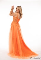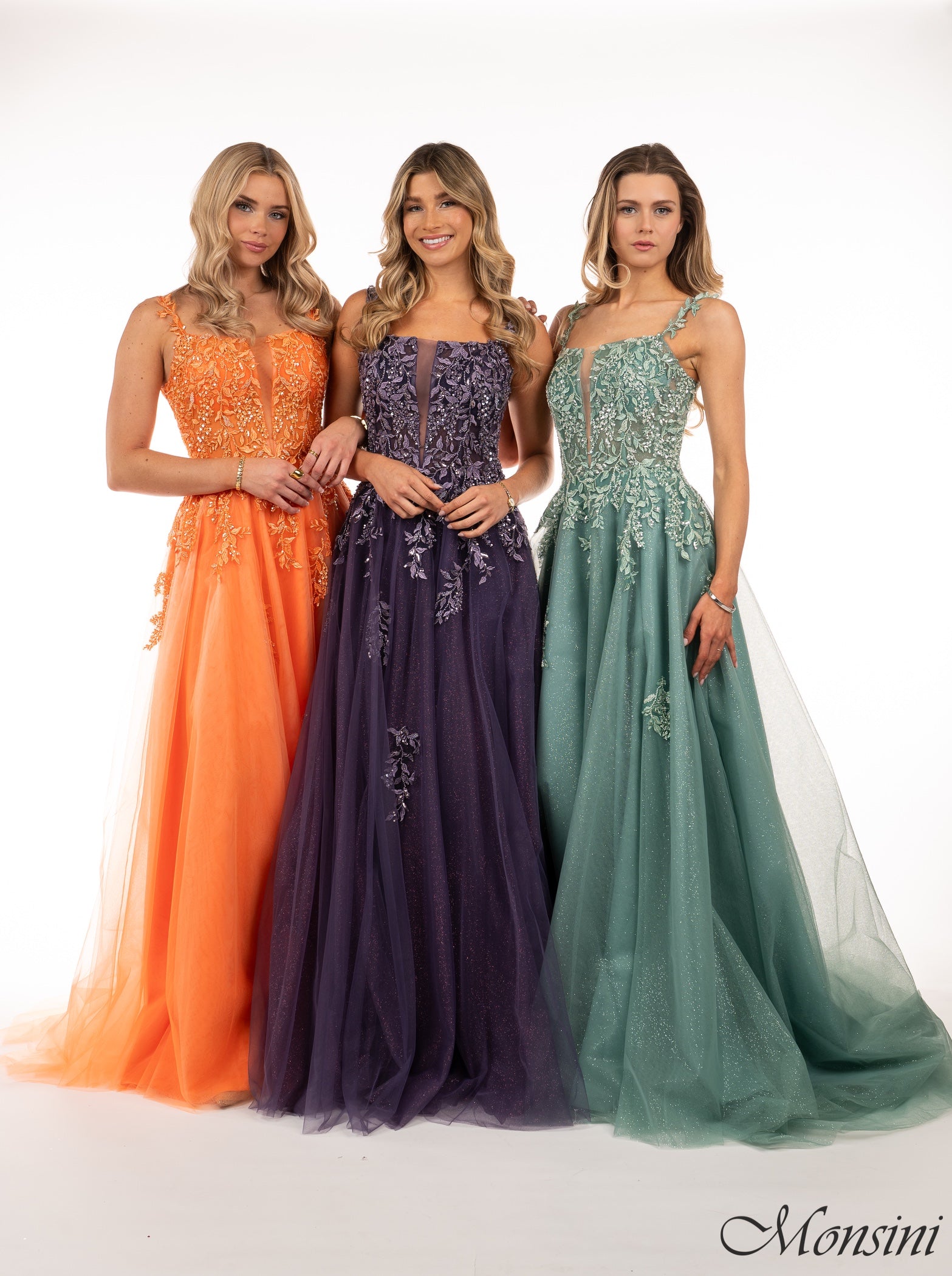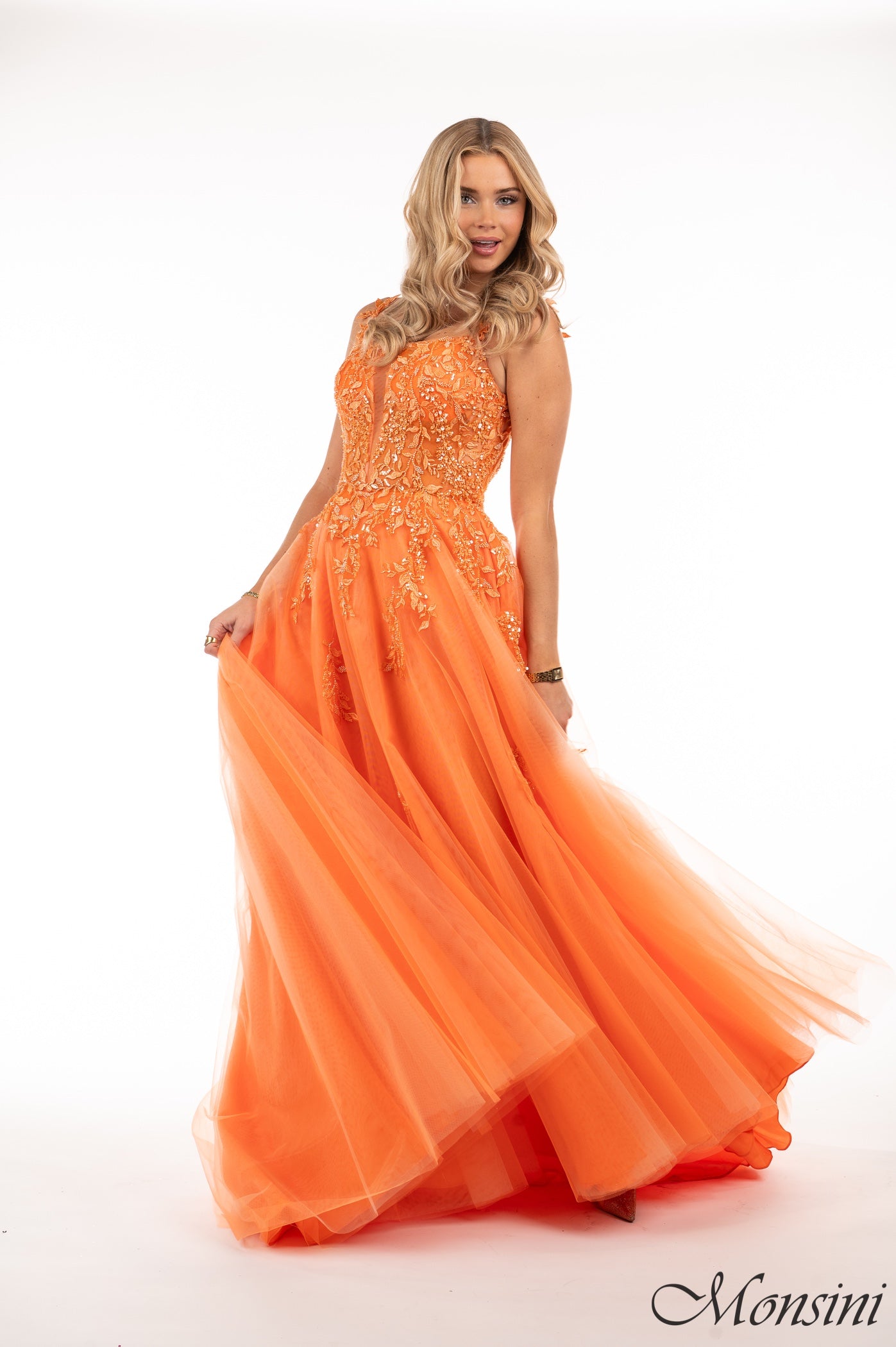 L'éblouissante robe longue en tulle scintillant, Maxime de Monsini, est ornée d’appliqués floraux brodés et de perles ton sur ton.