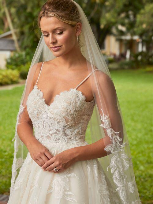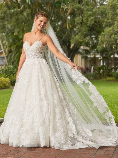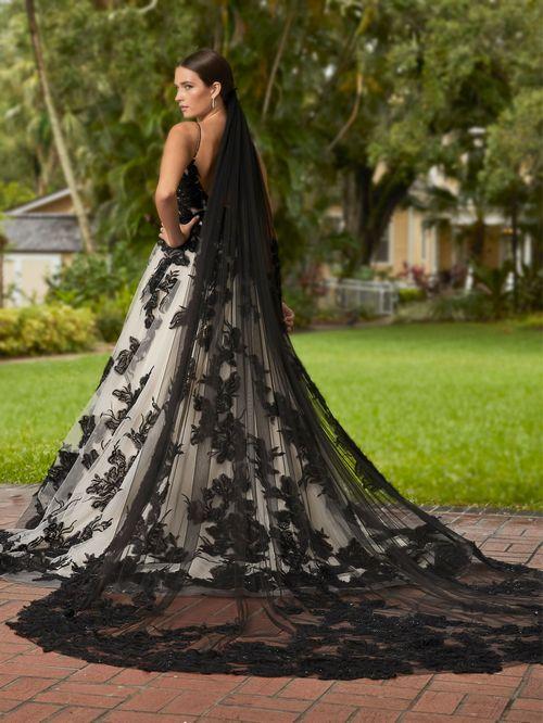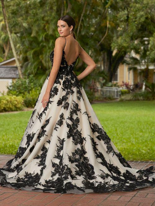 Descripción: Celebre su historia de amor con este cautivador vestido de gala con finos tirantes finos y pedrería. Disponible en negro/marfil y todo marfil. Este vestido hará que tu belleza nupcial realmente brille. Un atrevido estampado floral se coloca en el corpiño y la falda con espalda muy escotada eleva este estilo y su personalidad.