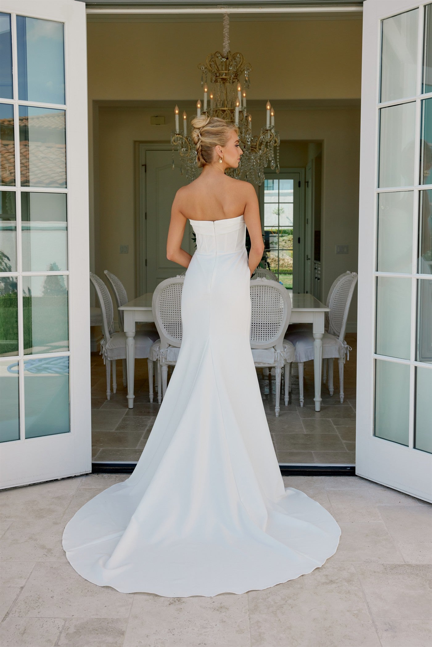 Sublimez cette robe avec des accessoires minimalistes : boucles d’oreilles délicates, coiffure lisse ou chignon bas, et un voile simple pour conserver son esprit épuré et moderne.