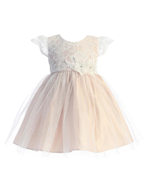 El vestido perfecto para ocasiones especiales para tu pequeña. Presenta una manga de encaje floral con parche floral en la cintura. Disponible en color rubor con tul cristal o blanquecino.