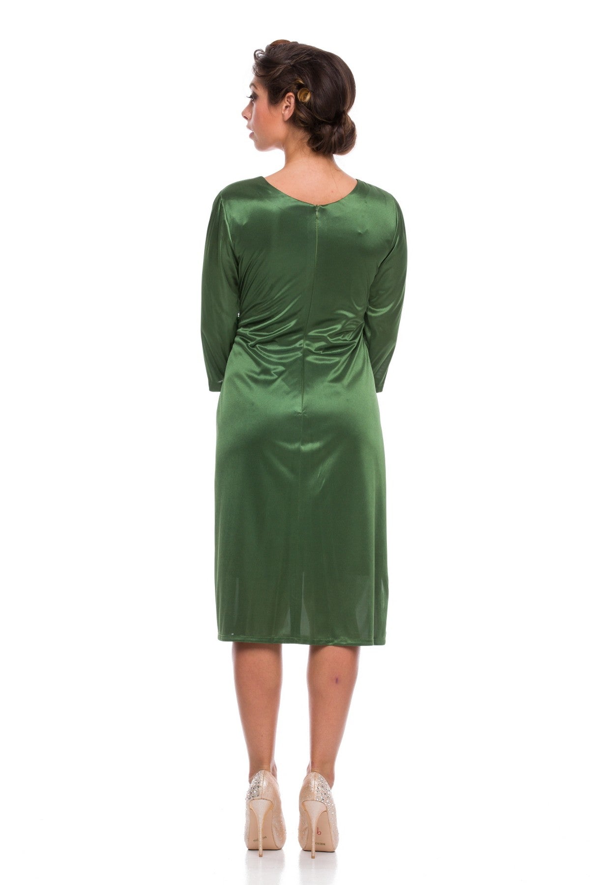 Falda corta recta, manga media, tejido satinado y fruncido en cintura, cuello redondo |