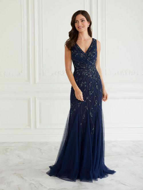 Vestido con detalle de perlas y bisutería. Modelo que afina la silueta. |