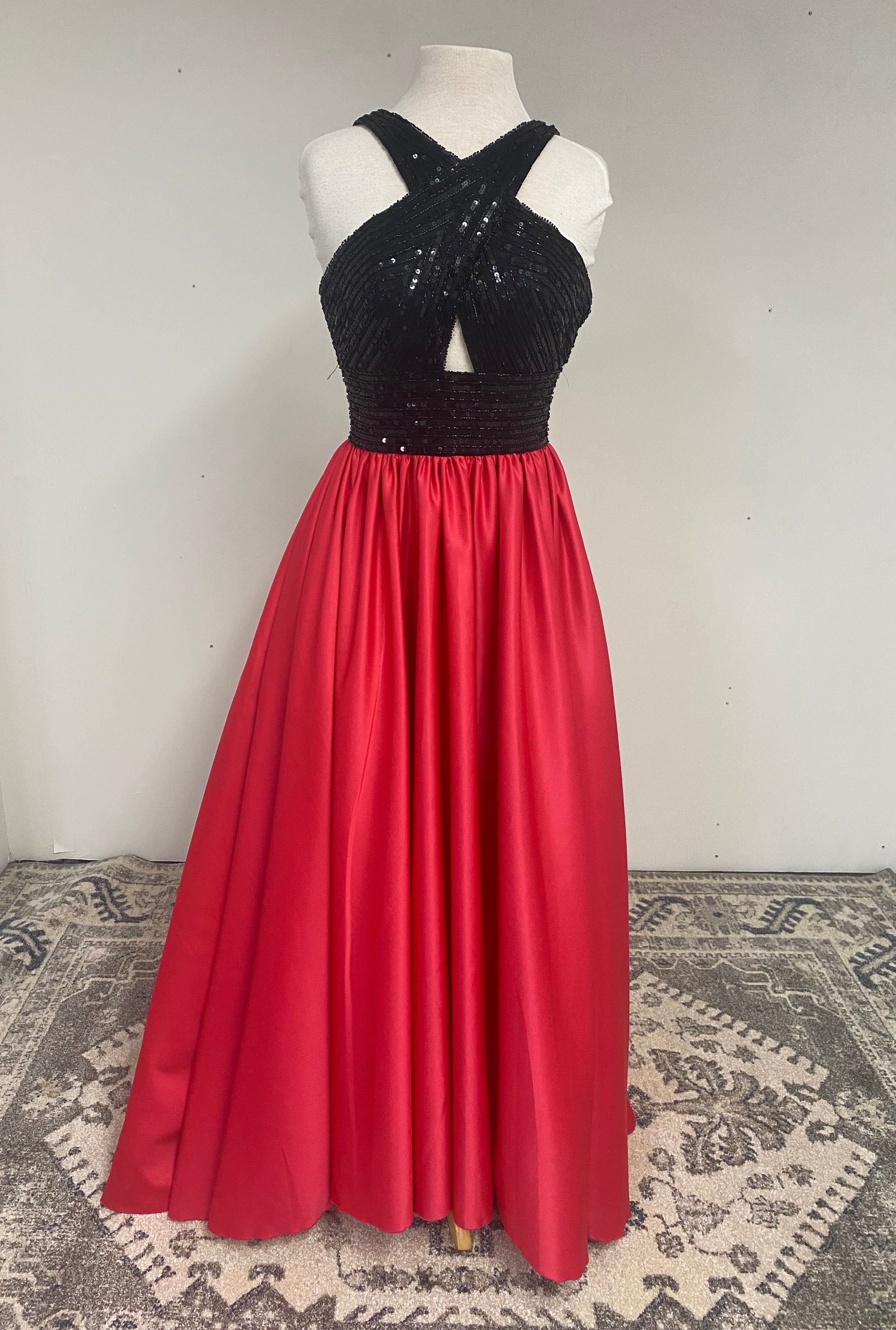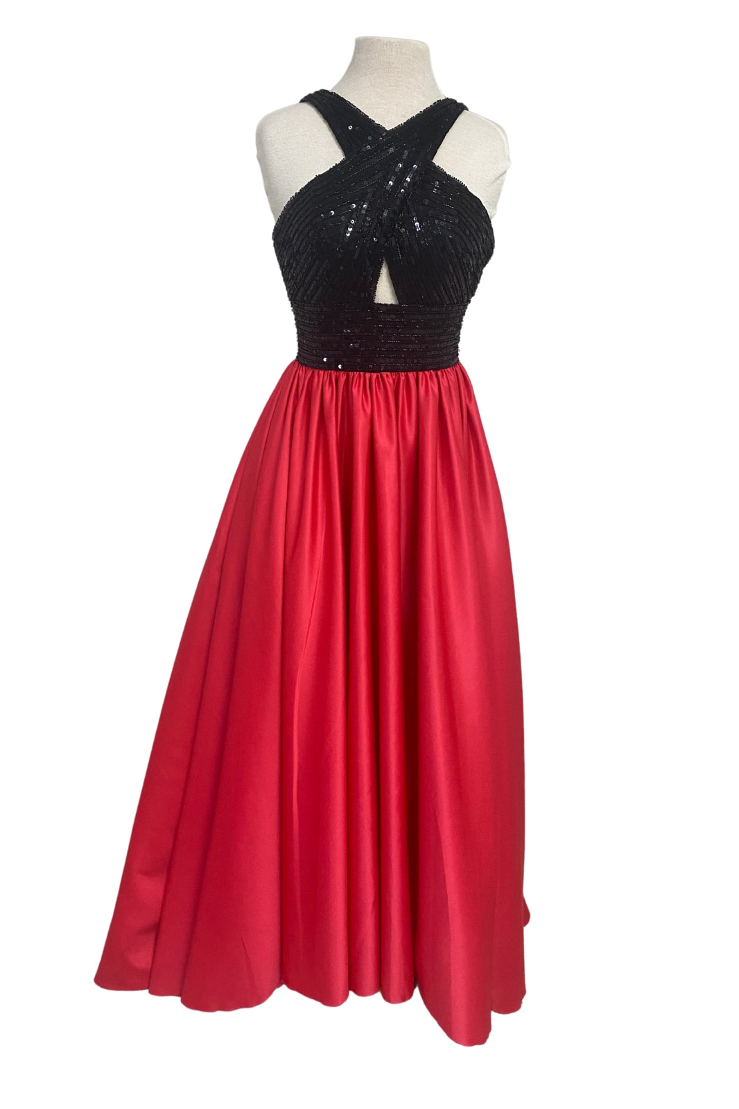 Este vestido de fiesta J0234 es perfecto para invitadas nocturnas con su top de lentejuelas y falda de satén. Su estilo princesa te hará sentir como una auténtica reina. Añade un toque de glamour a tu armario con este espectacular vestido de noche.