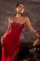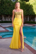 Sa coupe ajustée en satin scintillant met en valeur la silhouette, tandis que le corset transparent orné de pierres et de perles crée un effet bijou irrésistible.