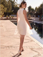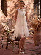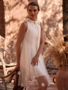 La robe de mariée courte Bluebell incarne la modernité et la légèreté. Conçue dans un tissu fluide et aérien, elle séduit par son col montant orné d’un délicat nœud qui apporte une touche raffinée. Sa coupe évasée est sublimée par un voile de tulle transparent qui enveloppe la silhouette avec grâce, créant un effet vaporeux et romantique. Le dos simple et élégant se ferme par une discrète fermeture, tandis que la longueur au-dessus du genou offre confort et liberté de mouvement pour une allure chic et contemporaine.