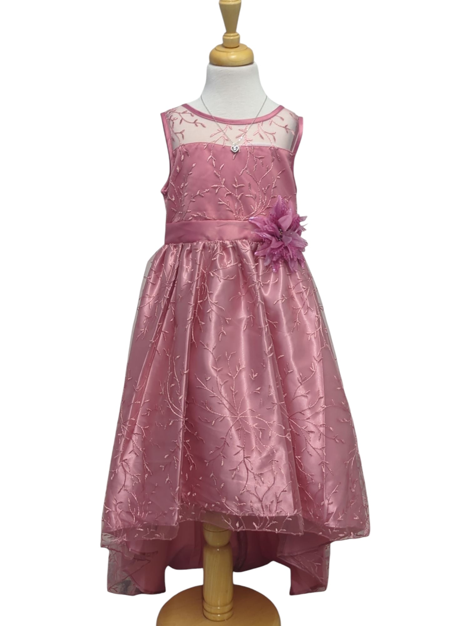 La robe modèle 8152 est une sublime robe de cérémonie pour fillette, confectionnée dans un satin rose aux reflets délicats. Elle se distingue par sa broderie florale sur le tissu transparent de l’encolure et la jupe, qui lui donne un aspect féérique et raffiné. Une fleur décorative ton sur ton vient rehausser la ceinture satinée à la taille. Sa coupe asymétrique (plus courte à l’avant) donne un style contemporain tout en conservant un effet princesse.