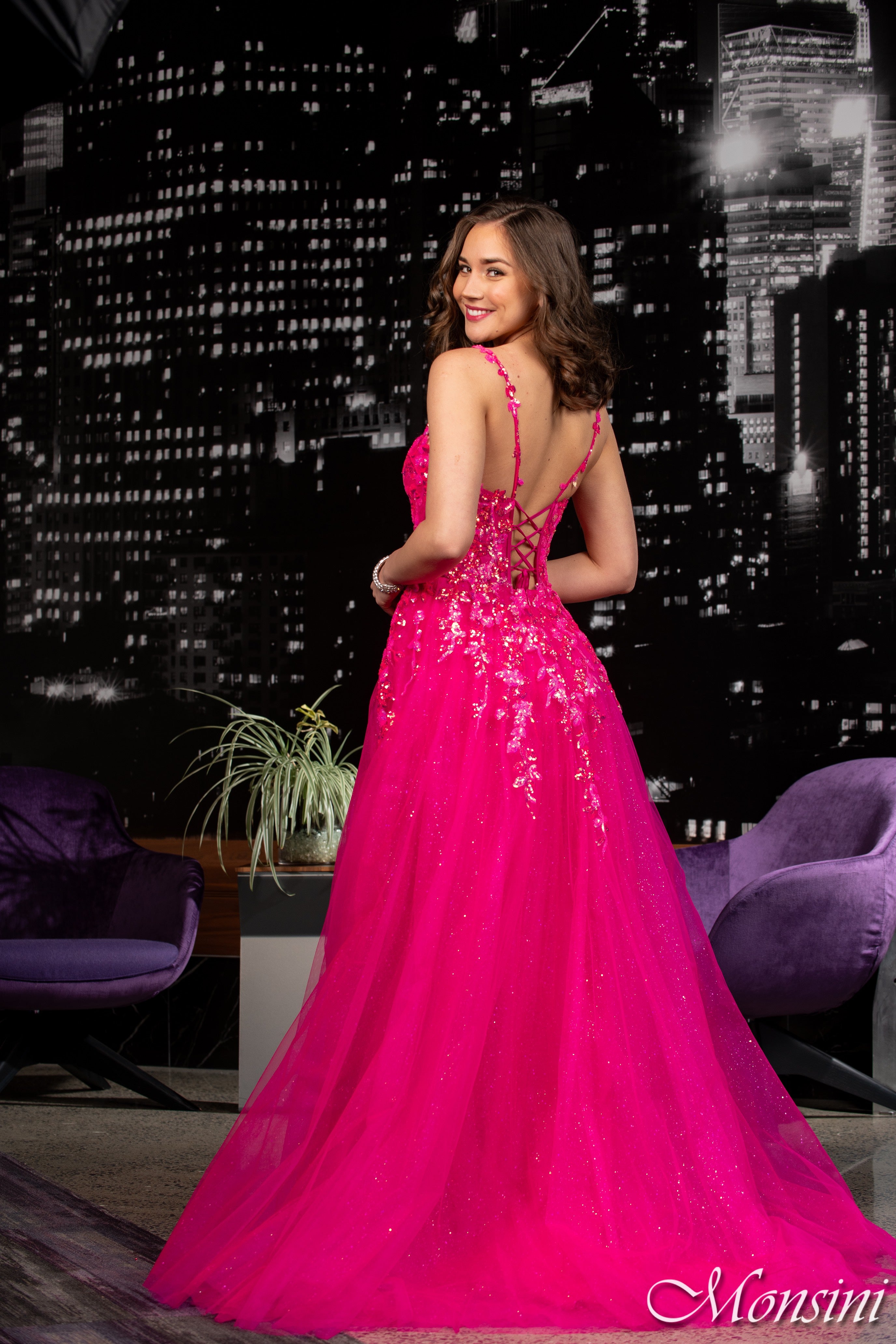 Deslumbrante y glamuroso, este vestido de fiesta fucsia es ideal para quienes quieren brillar en ocasiones especiales. El corpiño entallado, decorado con detalles brillantes, aporta un toque de elegancia y feminidad. El escote pronunciado es atrevido y sofisticado, mientras que la falda amplia ofrece un movimiento elegante. El acabado de encaje con cordones en la espalda añade un toque romántico.