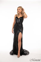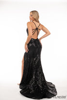 Une robe de soirée spectaculaire, entièrement ornée de sequins noirs qui captent la lumière à chaque mouvement.