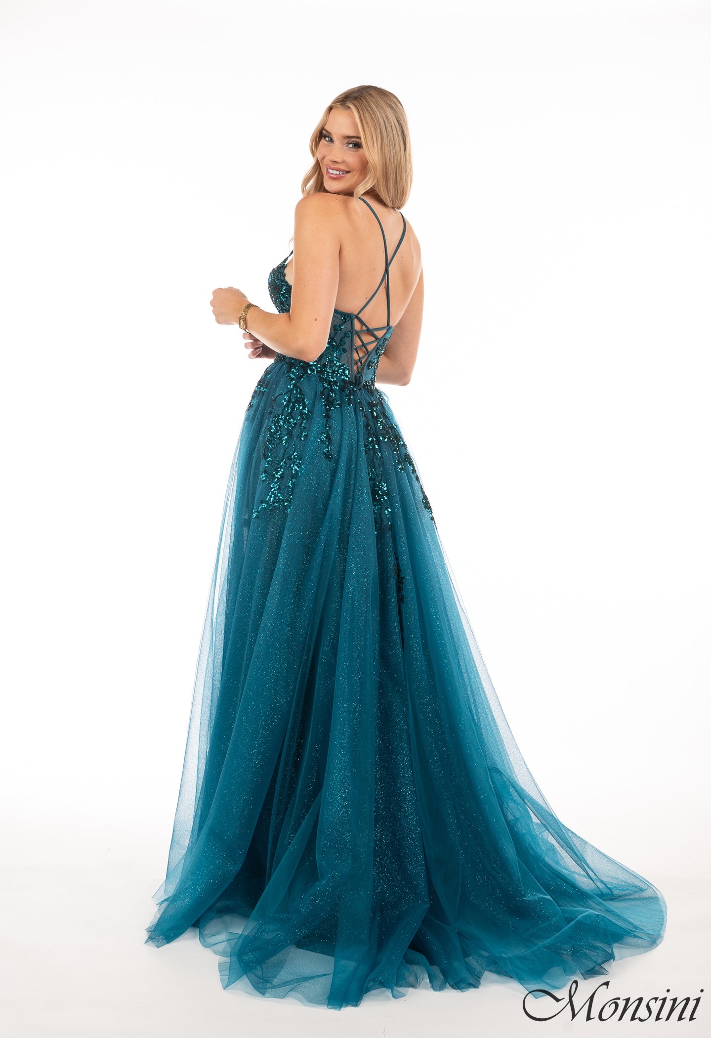 La robe Méline de Monsini est somptueuse au style princesse, mettant en valeur un corset transparent finement brodé de perles et de sequins ton sur ton.
