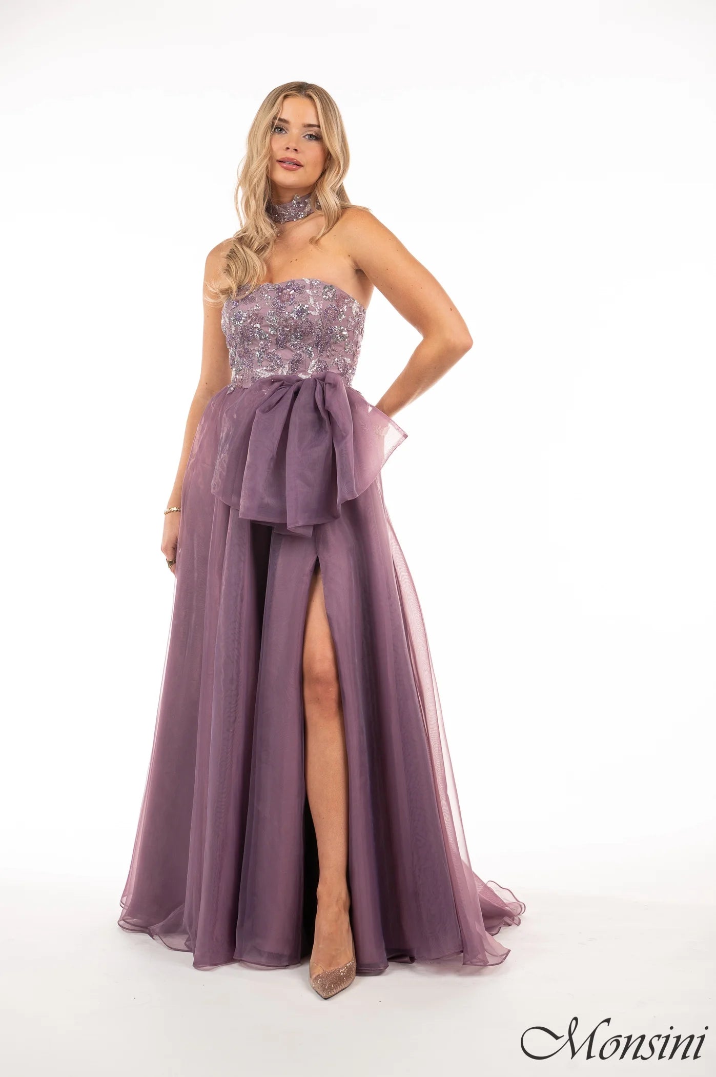 Cette robe Monsini séduit par son allure raffinée et romantique. Son corsage bustier est délicatement orné de broderies florales et de perles scintillantes, offrant un effet luxueux et féminin. Le détail du col ras-de-cou assorti ajoute une touche moderne et élégante.