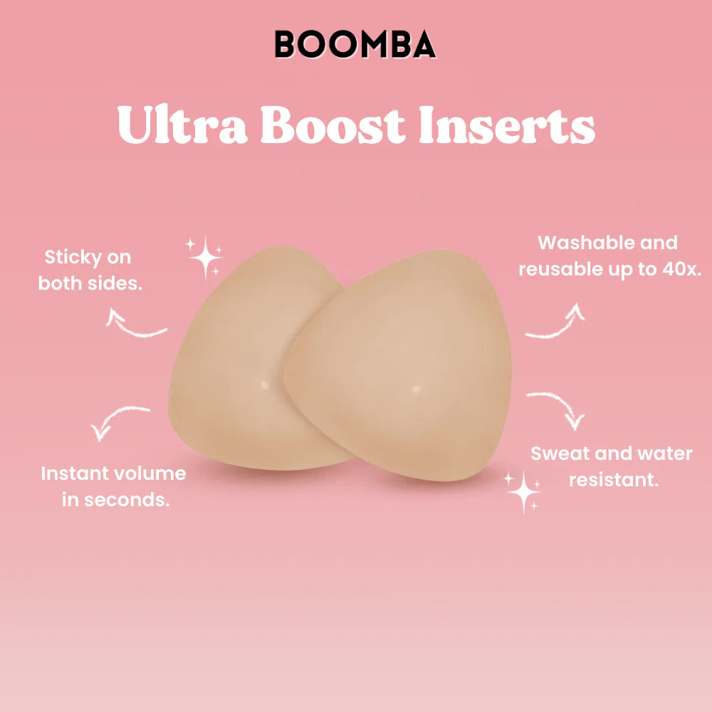 A diferencia de un sujetador adhesivo que se sostiene mediante adhesivo, los insertos BOOMBA se sostienen en la prenda y no pueden permanecer en su lugar por sí solos. Es fundamental usarlos con blusas ajustadas, estructuradas y ajustadas.