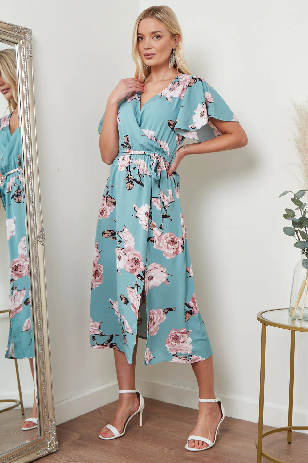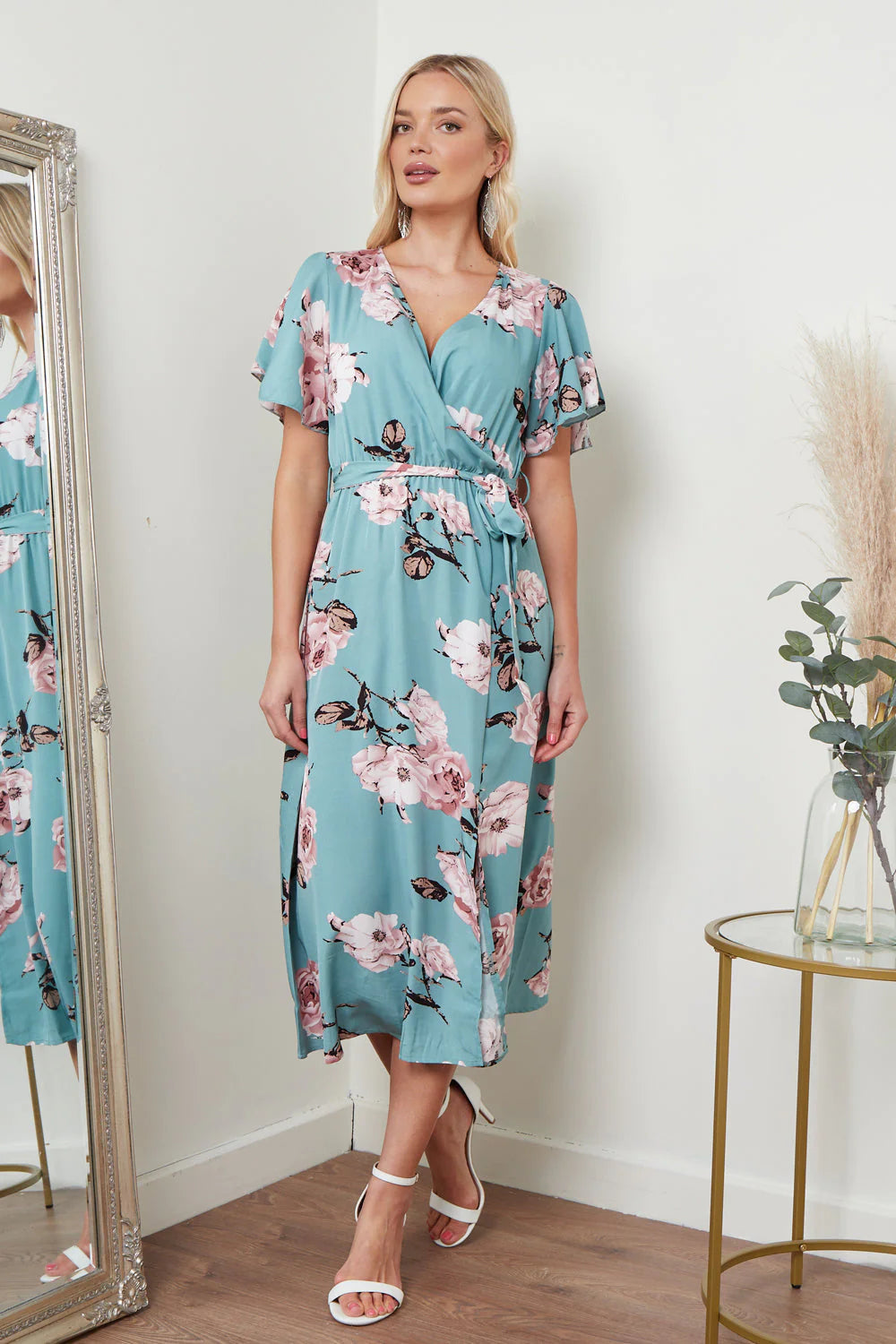 Vestido estilo cruzado, largo medio con abertura suave el frente, hermoso estampado floral |